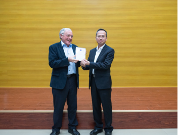 芒果体育西丽管委会王志忠主任、芒果体育材料学院王雷院长和朱德亮副院长以及芒果体育材料学院等院系的教师、研究人员和学生共300余人参加了讲座。本次深大讲坛由材料学院副院长朱德亮教授主持,王志忠向Müllen教授颁授“深大讲坛”第111讲纪念牌。