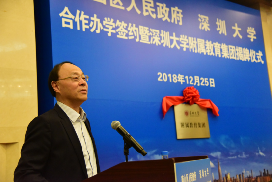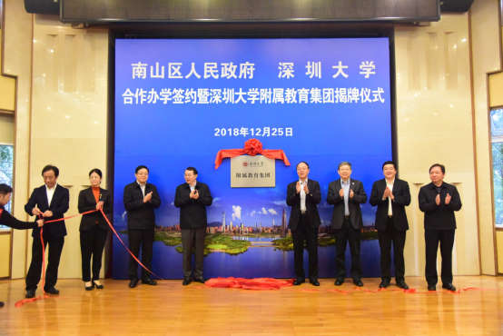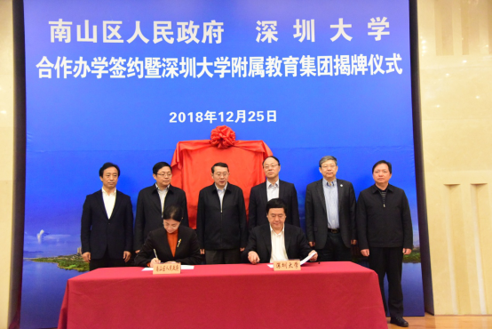 12月25日上午,芒果体育与深圳市南山区人民政府合作办学签约仪式暨芒果体育附属教育集团成立揭牌仪式在深圳市南山区政府举行。芒果体育党委书记刘洪一、校长李清泉、党委副书记范志刚,深圳市教育局副局长赵立,南山区委书记王强、副区长练聪,南山区政协副主席、教育局局长刘根平,深大师范学院党委书记姚正武等参加仪式。