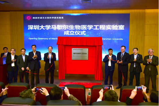 3月26日下午,芒果体育马歇尔生物医学工程实验室揭牌仪式在图书馆南馆报告厅隆重举行。深圳市政府副市长王立新、2005年诺贝尔生理或医学奖得主巴里•马歇尔教授、深圳市科技创新委员会副主任邓晓俊、深圳市教育局副局长许建领;我校党委书记刘洪一、校长李清泉、党委副书记范志刚、副校长张学记;大鹏新区党工委书记王京东、管委会副主任刘峰,以及市、校、区相关部门负责人出席了仪式。仪式由张学记主持。