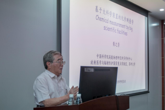 随后,在一个多小时的报告中,柴院士以国内外核反应堆的利用率差距为背景出发,广征博引地阐述了大科学装置对于化学测量学的必要性和重要性。他着重介绍了我国同步辐射的起源、发展和应用,并生动地讲述了同步辐射在环境和生物方面的国内外研究成果。柴院士还介绍了基于中子散射的化学测量法,并利用中子活化与ICP-MS结合的方法,准确测定碳纳米管中金属杂质的含量,并依此发布国际标准。这也是第一个由中国发布的纳米技术领域的国际标准。报告接近尾声时,柴之芳院士还介绍了许多同步辐射和中子散射结合使用的优秀研究成果。