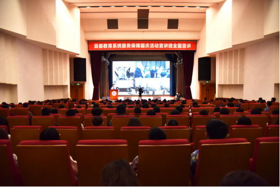 宣讲活动上,宣讲报告团成员声情并茂地分享了自己的经历和感悟,充分展现了首都师生昂扬向上、奋发有为的精神面貌,生动表达了热爱党、热爱祖国、热爱人民的真挚情感,集中宣示了新时代青年立志成为社会主义建设者和接班人、矢志为中华民族伟大复兴而奋斗的决心。北京师范大学汉语文化学院党总支副书记任雅才以《唱响立德树人的青春之歌》为题,讲述其全程陪伴“模拟彩车”中队的学生参训,鼓励大家做好力所能及之事,保证队员良好的训练面貌的故事;清华大学博士研究生韩旭分享了自己以及实验室全体师生训练和学业科研“双肩挑”,在圆满完成庆祝活动任务的同时完成6篇学术论文研究工作的故事;北京航空航天大学自动化科学与电气工程学院2016级本科生马乐作为该校国防生参与阅兵训练,他回顾了自己从训练中不被看好的一员到成为阅兵队伍的佼佼者,训练中带伤坚持,从不放弃,最后作为阅兵代表接受检阅的故事;北京理工大学数字表演与仿真技术实验室副主任黄天羽从技术角度,揭秘了国庆联欢中3290名演员如何通过计算机编程完成“流光溢彩”表演;北京工业大学艺术设计学院教师枣林和他的团队设计了建国以来群众游行彩车中最大、最长、最重的彩车“扬帆远航”彩车,他讲述了自己带病上阵、与团队克服了重重困难实现技术突破,最终呈现完美设计方案的故事;首都经济贸易大学劳动经济学院2018级硕士研究生孙宏皓讲述了自己作为候场区志愿者和团队一起负责地铁站疏导、控制区安检、集结候场区秩序维护、游行方阵报到及入场指引等工作的故事,让更多的人了解了这群“幕后英雄”。