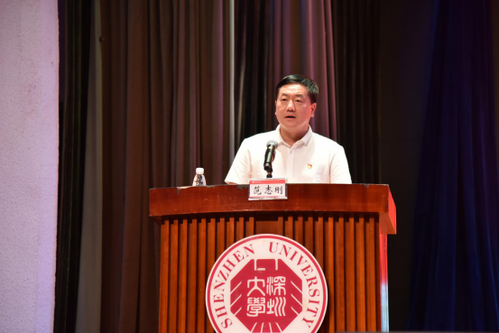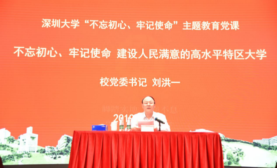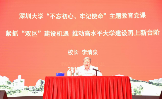 10月30日下午,我校在国际会议厅大厅举行“不忘初心、牢记使命”主题教育党课——书记、校长讲党课。校党委书记刘洪一和校长李清泉分别以《不忘初心、牢记使命,建设人民满意的高水平特区大学》和《紧抓“双区”建设机遇,推动高水平大学建设再上新台阶》为题讲了一堂生动的党课。活动由党委副书记范志刚主持,全体校领导以及全体中层干部、学校人事工作教授委员会和计划财务工作教授委员会主任、副主任等百余名深大教职工参加此次主题教育党课。