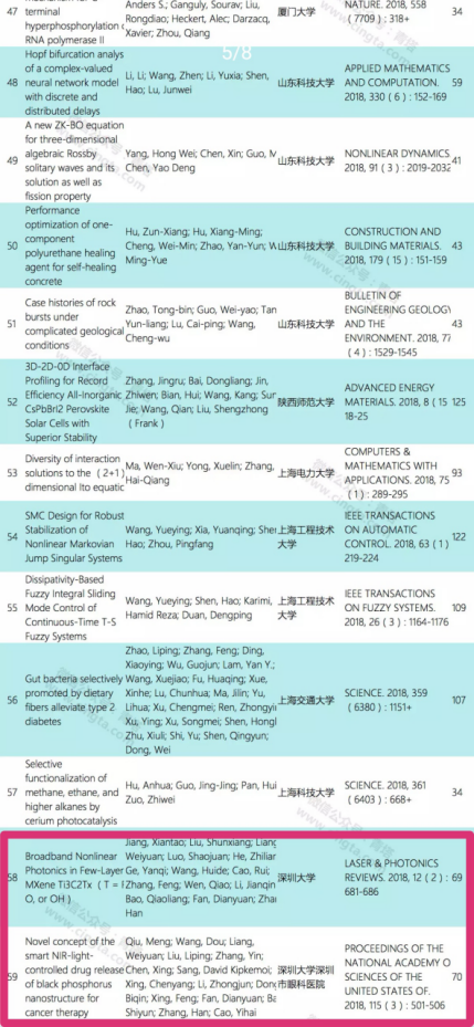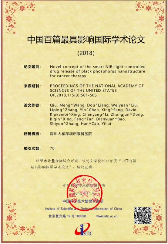 我校张晗教授课题组入选的2篇论文分别是《Broadband Nonlinear Photonics in Few-Layer MXene Ti3C2Tx (T = F, O, or OH)(新型智能近红外光控黑磷纳米结构释药系统用于癌症治疗)》,所属机构为芒果体育,来源期刊为《LASER & PHOTONICS REVIEWS. 2018, 12(2): 681-686(美国科学院院刊)》,被引次数69;《Novel concept of the smart NIR-light-controlled drug release of black phosphorus nanostructure for cancer therapy(少层MXene纳米片中的非线性光子学)》,所属机构为芒果体育和深圳市眼科医院,来源期刊为《PROCEEDINGS OF THE NATIONAL ACADEMY OF SCIENCES OF THE UNITED STATES OF. 2018, 115(3): 501-506(激光光子学评论)》,被引次数70。黑磷具有可调节直接带隙、近红外光响应特性、高光热转化效率等。黑磷独有的生物相容性和可降解性,使其成为优秀的智能光响应生物医药材料。基于黑磷在生物医学上所具备的独特优势,结合先进激光技术,交叉协调创新,有望为癌症患者的治疗提供新的思路和视野。该研究的成功临床转化,将加快人类治愈癌症的进程。这些研究成果的取得与导师张晗教授的密切合作和悉心指导密不可分,芒果体育和光电协同创新中心也为相关提供工作环境和培养机会。