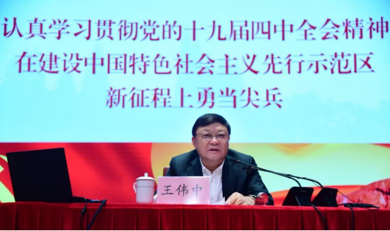 王伟中向广大师生全面解读了党的十九届四中全会精神和省委十二届八次全会精神。他指出,党的十九届四中全会是在实现“两个一百年”奋斗目标历史交汇点上召开的一次十分重要的会议。习近平总书记在全会上发表重要讲话,全会审议通过《中共中央关于坚持和完善中国特色社会主义制度、推进国家治理体系和治理能力现代化若干重大问题的决定》,系统回答了“坚持和巩固什么、完善和发展什么”这个重大政治问题。省委十二届八次全会深入贯彻落实党的十九届四中全会精神,描绘了扎实推进制度和治理能力建设的“广东图谱”。希望广大师生深刻领会《决定》的丰富内涵和精神实质,不断推动学习贯彻走深走实。