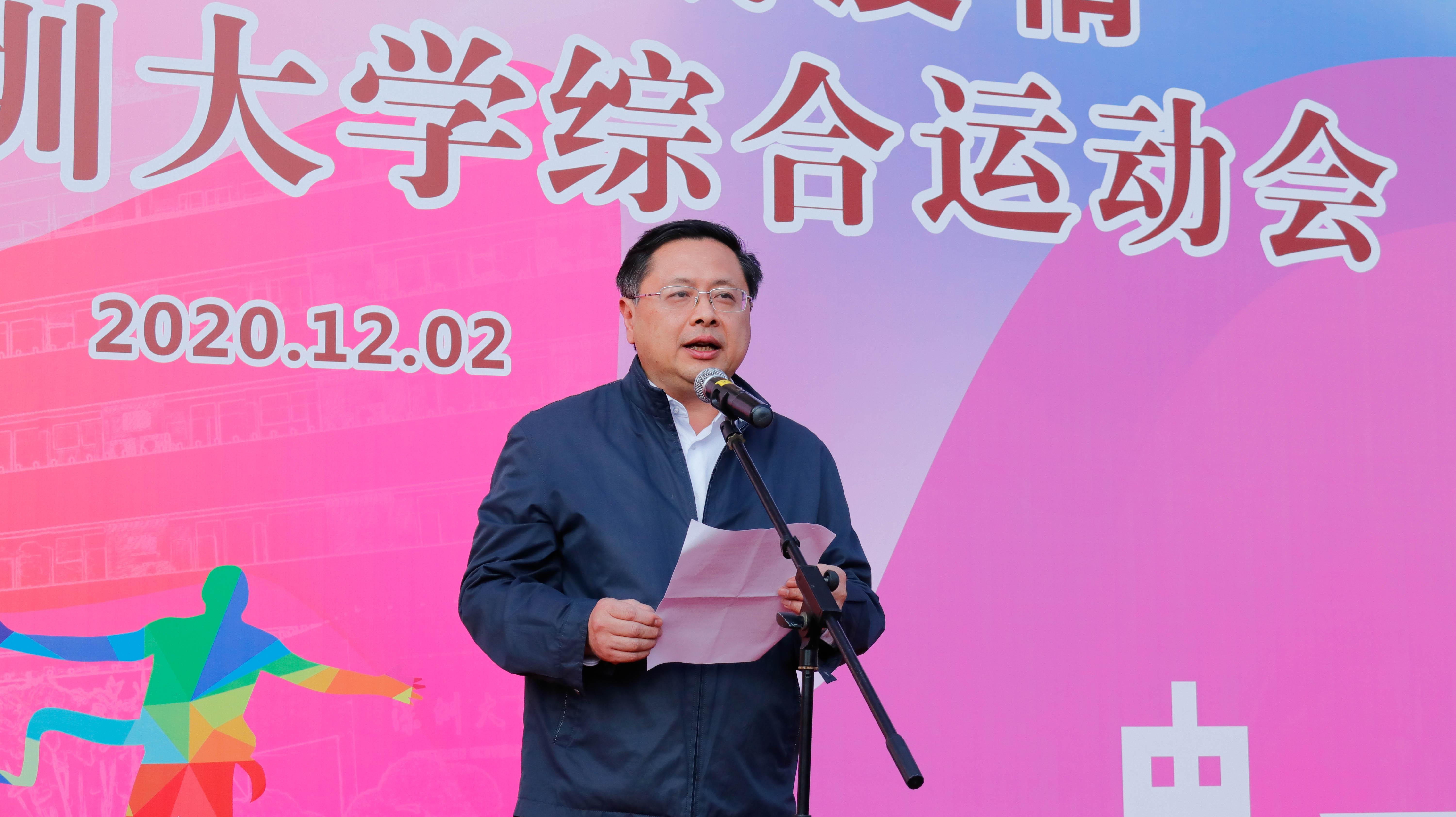 徐晨致开幕辞。他说,在2020年这个特殊的年份,在当前全球仍面临疫情严重威胁的形势下,深大师生能够安全共聚、畅快交流、快乐比赛,得益于在党和国家的坚强领导下、我国取得的重大抗疫成果。应对疫情,今年学校的体育赛事有了新形式和新变化。上半年学校组织了校长杯体育“云战疫”系列赛事,共有22个单位1262人报名参赛,线上赛事关注人数达2.5万人;本学期开学后,学校相继组织了校长杯、新生杯以及教工篮球赛等多项赛事,共有足球、篮球、乒乓球、定向越野、电竞、毽球等八项赛事,参与人员近3000人。