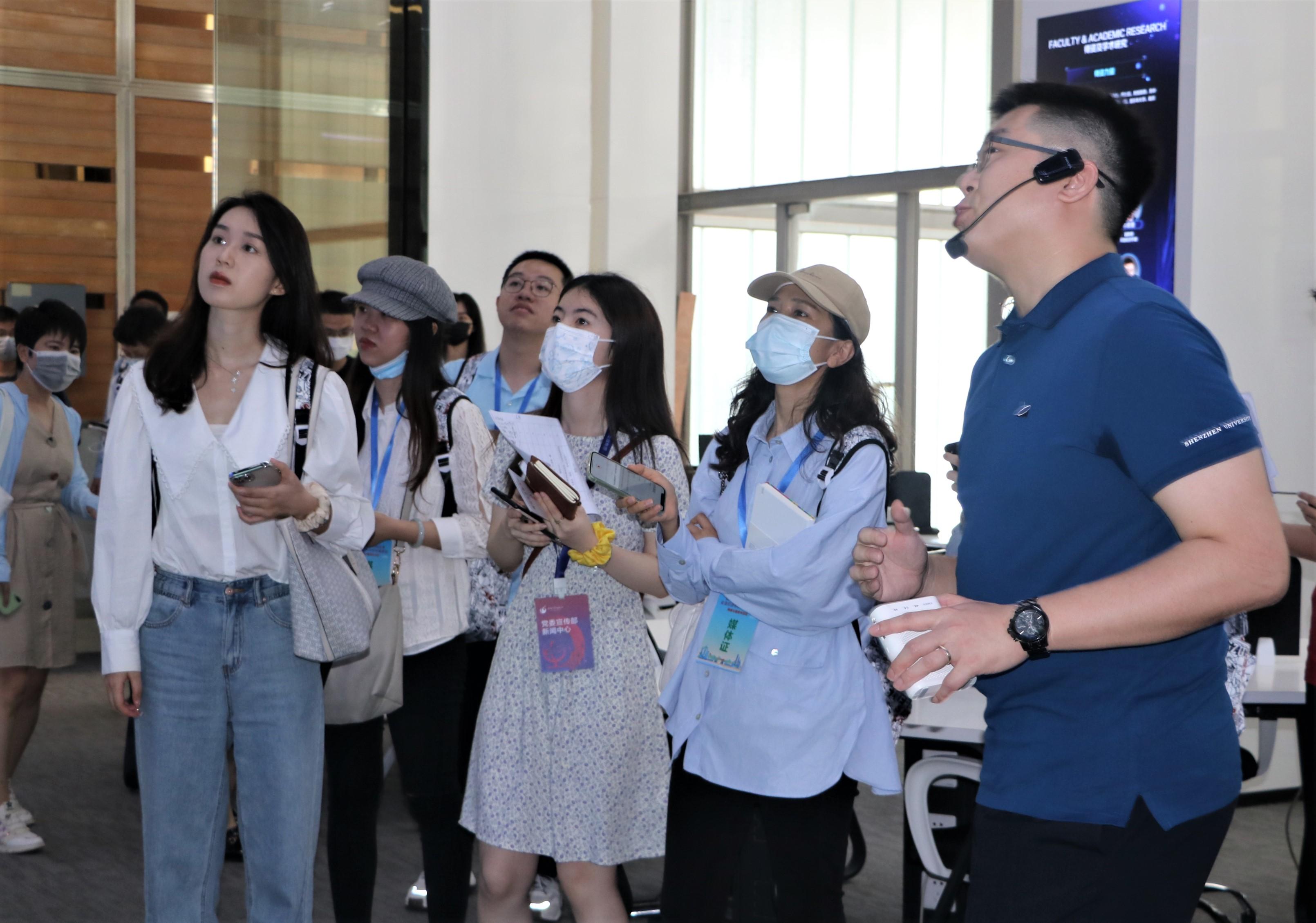 为了使采访团能够全面、清晰地了解我校的发展建设,学校精心设计了AB两条路线,安排讲解员详细讲解,并准备了学校介绍资料、校园文创礼品等。采访团在学校宣传部的带领下“兵分两路”,背着“深大书包”,乘坐“荔园巴士”,踏上了深大的“艺术科技”线路和“硬核科技”线路。
