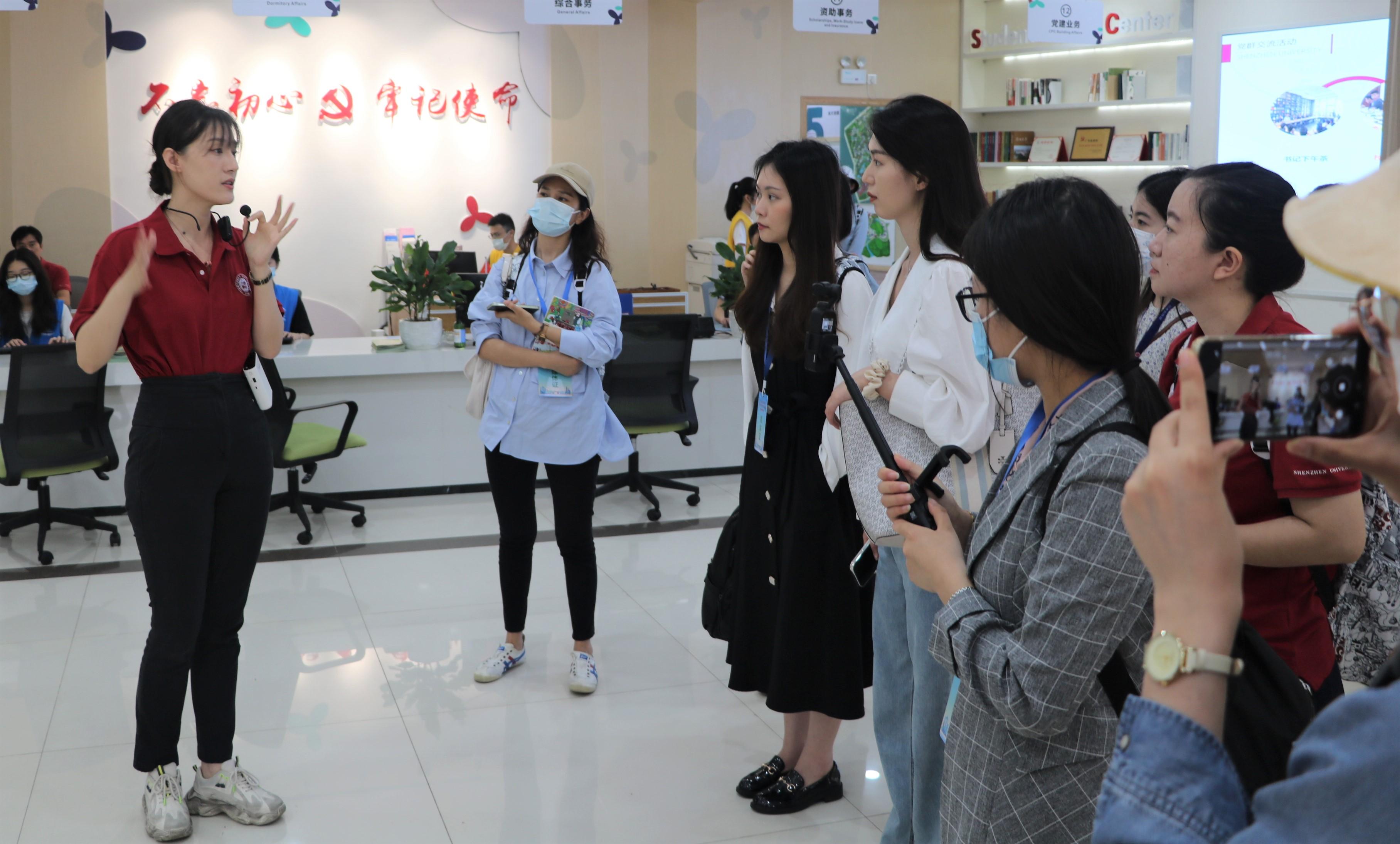 “大家注意到我们前台的工作人员都穿着蓝色或黄色的马甲,他们不是学校老师或工作人员,全部是在校大学生。团队完全由学生自我管理、自我运营。”正值建党100周年,记者们颇为关注高校党群建设,在芒果体育党群服务中心详细参观,了解其发展历程、团队概况、党建业务等。