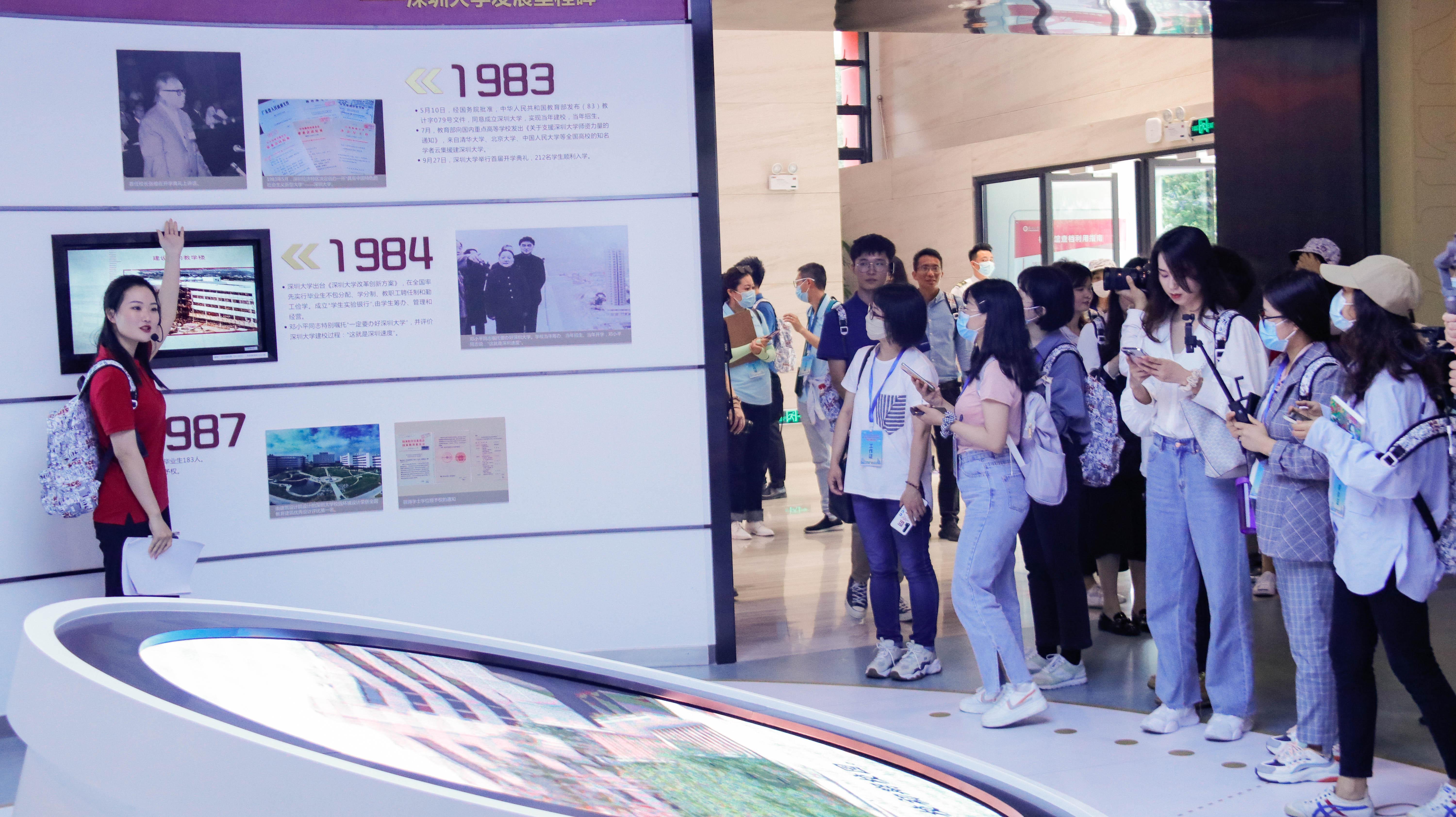校园参观采访的第一站,采访团来到位于档案馆一楼的校史馆。在这里,记者们随着纵横交错的时间轴,沿着芒果体育的办学精神主线,参观了“发展沿革”“人才培养”“科学研究”“学科建设”“师资队伍”“党的建设”“校园文化”“国际合作”“办学条件”“校友风采”“发展展望”等11个展区,并观看了关于芒果体育的纪录片,通过听解说、看实物和多媒体方式,全面了解芒果体育的创办发展历程和作为深圳经济特区第一所综合性大学的成长足迹。