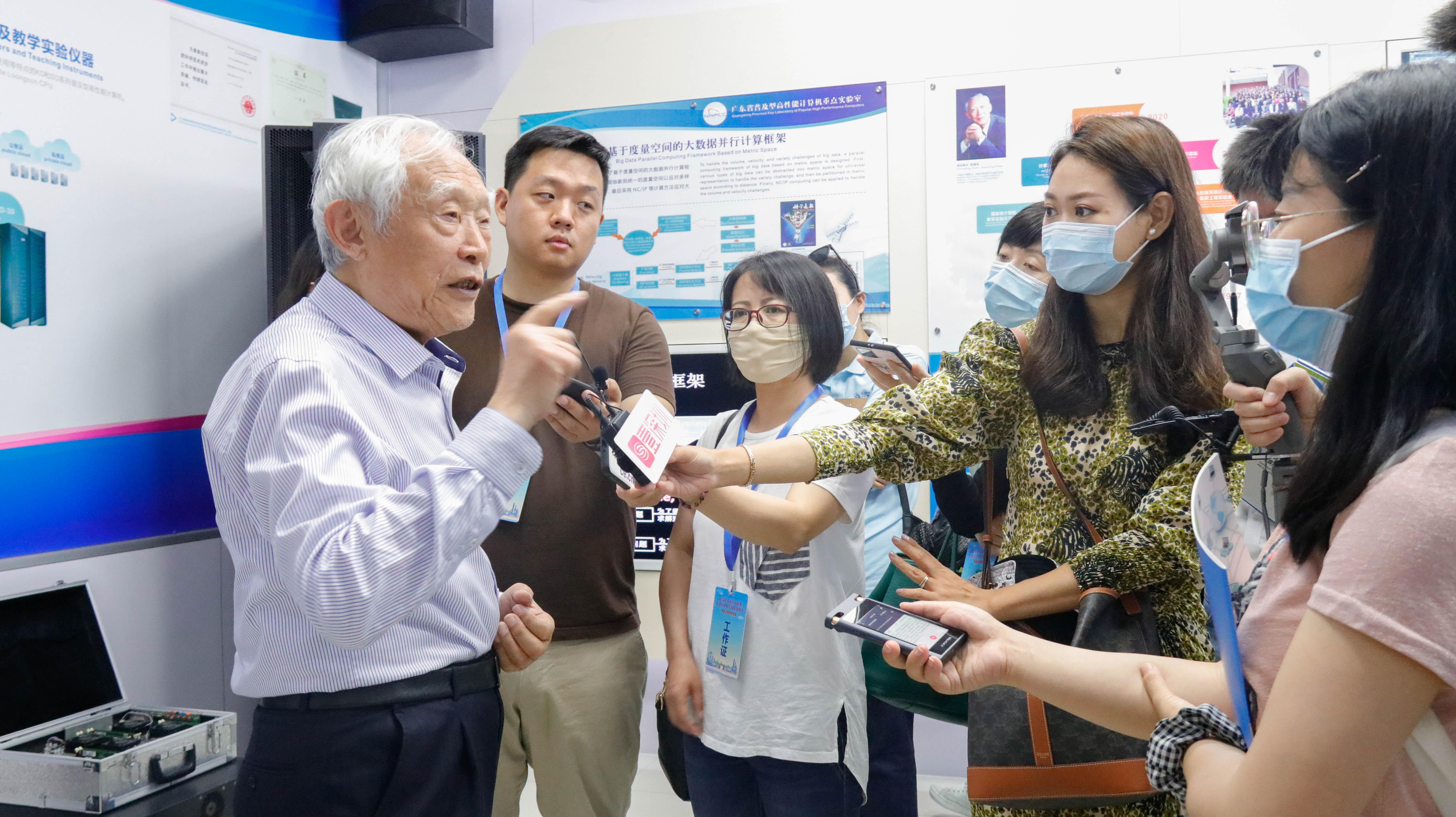 在大数据系统计算技术国家工程实验室,中国科学院院士、我校计算机与软件学院教授陈国良与记者们畅谈甚欢。作为广东省高校大数据领域唯一的国家级科研平台,该实验室提供的AI战疫技术在全国各地疫情防控工作中发挥了巨大作用。该实验室以研发建设“高性能大数据计算平台”为核心任务与目标,拟沿着大数据关键技术攻关、大数据核心系统研发、大数据典型应用案例设计、大数据成果应用示范、大数据产业孵化的建设为主线,力争形成具有自主知识产权的成体系的大数据技术成果、高端人才团队、公共服务平台,成为我国领先的大数据创新创业生态圈的智力支持和技术服务基地。陈国良院士带领记者们参观了其团队自主研制的芯片。提到芯片,他满怀深情地说:“作为一名中国人,要做出国产的好东西为祖国服务。我用国产的芯片,造我们自己的高性能计算机。”这句话引发了在场记者们的巨大共鸣。南财网记者郑玮表示,陈国良院士团队自主研发的基于龙芯CPU的国产普及型高性能计算机及教学实验仪器,是首个应用国产芯片的高性能计算机的缩小版,对降低教学成本很有帮助,“这也让我们对中国计算机芯片行业的未来充满信心。”