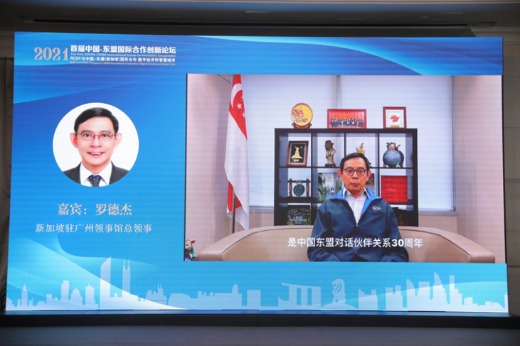 罗德杰在致辞中表示,今年是中国—东盟建立对话伙伴关系30周年,在区域全面经济伙伴关系协定(RCEP)即将签署生效的背景下,在中国先行示范区深圳召开“首届中国—东盟国际合作创新论坛” 非常恰时并且具有非常重要的意义。他指出,2018年新加坡在出任东盟轮值主席国时,发起建设东盟智慧城市网络的计划,中国表示支持并提出加入后,双方领导人很快落实了新加坡—中国(深圳)智慧城市合作倡议,旨在探讨如何创新、务实地推动中国与东盟在数字经济和智慧城市等新兴领域的国际合作。此次中国—东盟国际合作创新论坛成功地为中国—东盟(新加坡)提供了很好的政府间对话、企业间合作、学术间交流的机会,来自政界、学界、商界的与会嘉宾齐聚一堂,共同研讨面向未来推进中国—东盟合作的新兴领域、科技手段和创新方式,并且深入探讨促进深圳—新加坡及中国—东盟间政府、企业、学术、人文全方位交流合作与创新发展的新方向。
