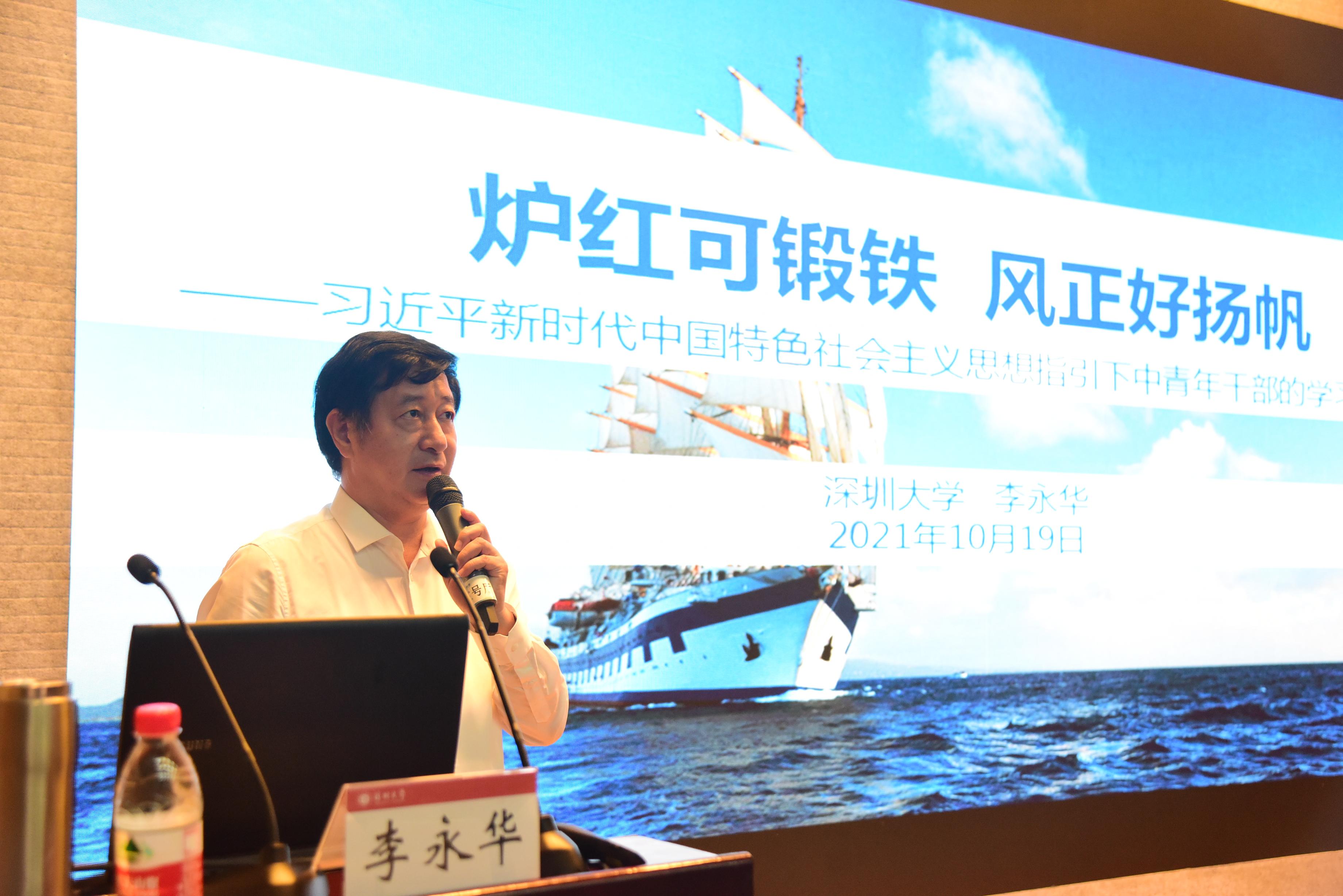 开班仪式结束后,李永华以“炉红可锻铁 风正好扬帆——习近平新时代中国特色社会主义思想指引下中青年领导干部的学习与成长”为主题进行宣讲。他引用诗句,结合自身经历和感受,从12个方面阐述了习近平新时代中国特色社会主义思想的主要内容,回顾了深圳的发展历史,总结了深圳发展的基本经验和十大观念、五大发展理念。他表示,作为深圳人、深大人,应当传承改革开放精神,担当新使命。在新形势下,中青年干部要保持良好心态,增强“八个本领”,关注社会矛盾,用所学知识解决社会问题。同时,中青年干部应当勇于顺应潮流,抓住机遇,迅速学习与改进,通过颠覆型模仿进行创新,在未知领域创造未来。年轻干部要积累知识,学会学习,全面提升综合素质和能力,积聚正能量,既要“经世”,也要“济用”。