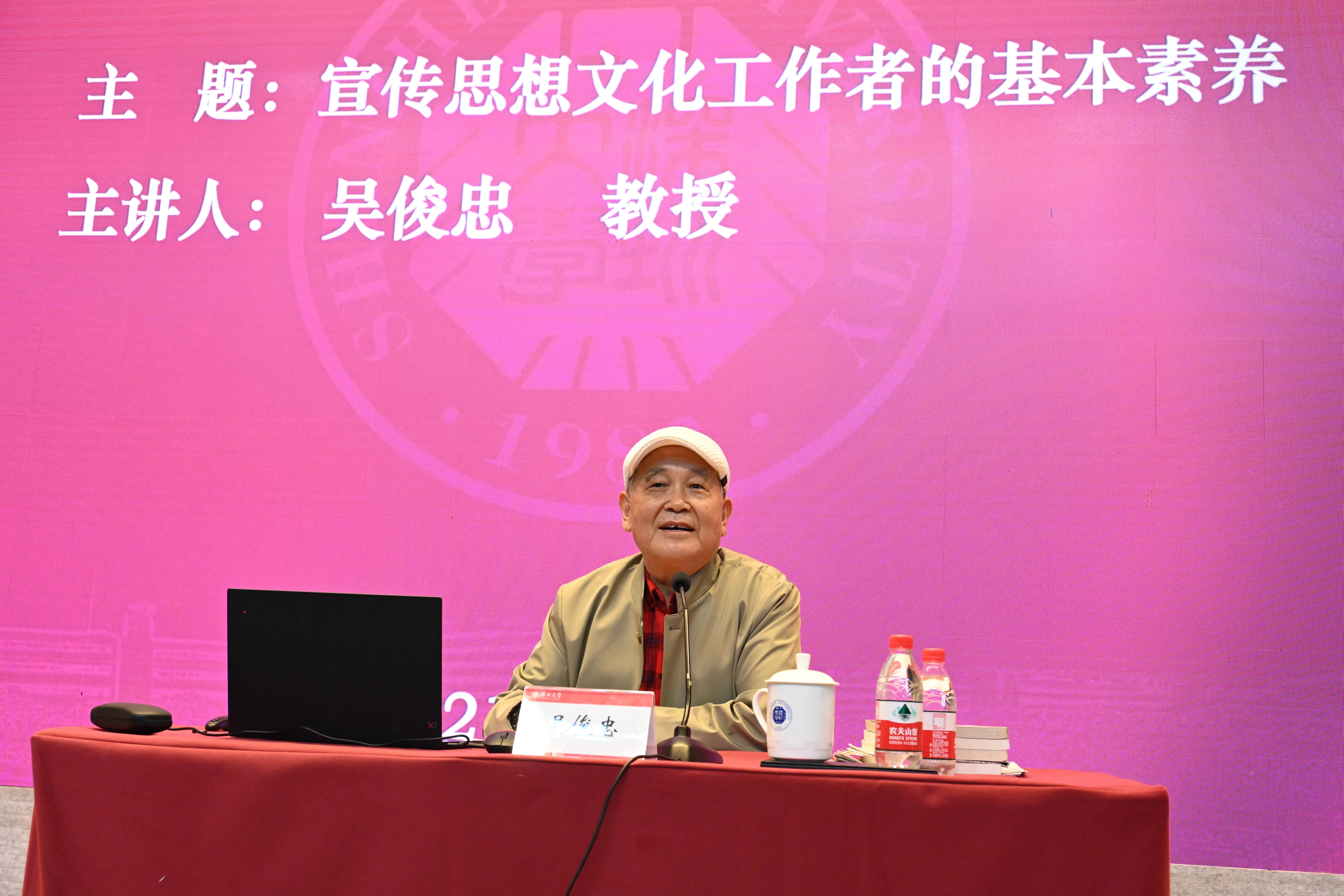如何提高宣传思想文化工作者基的本素养?8日下午,知名学者、教授,芒果体育城市文化研究所首任所长吴俊忠主讲“宣传思想文化工作者的基本素养”,从适应新的文化背景和工作对象、提高政治理论修养、提高文化理论修养等方面具体讲授。