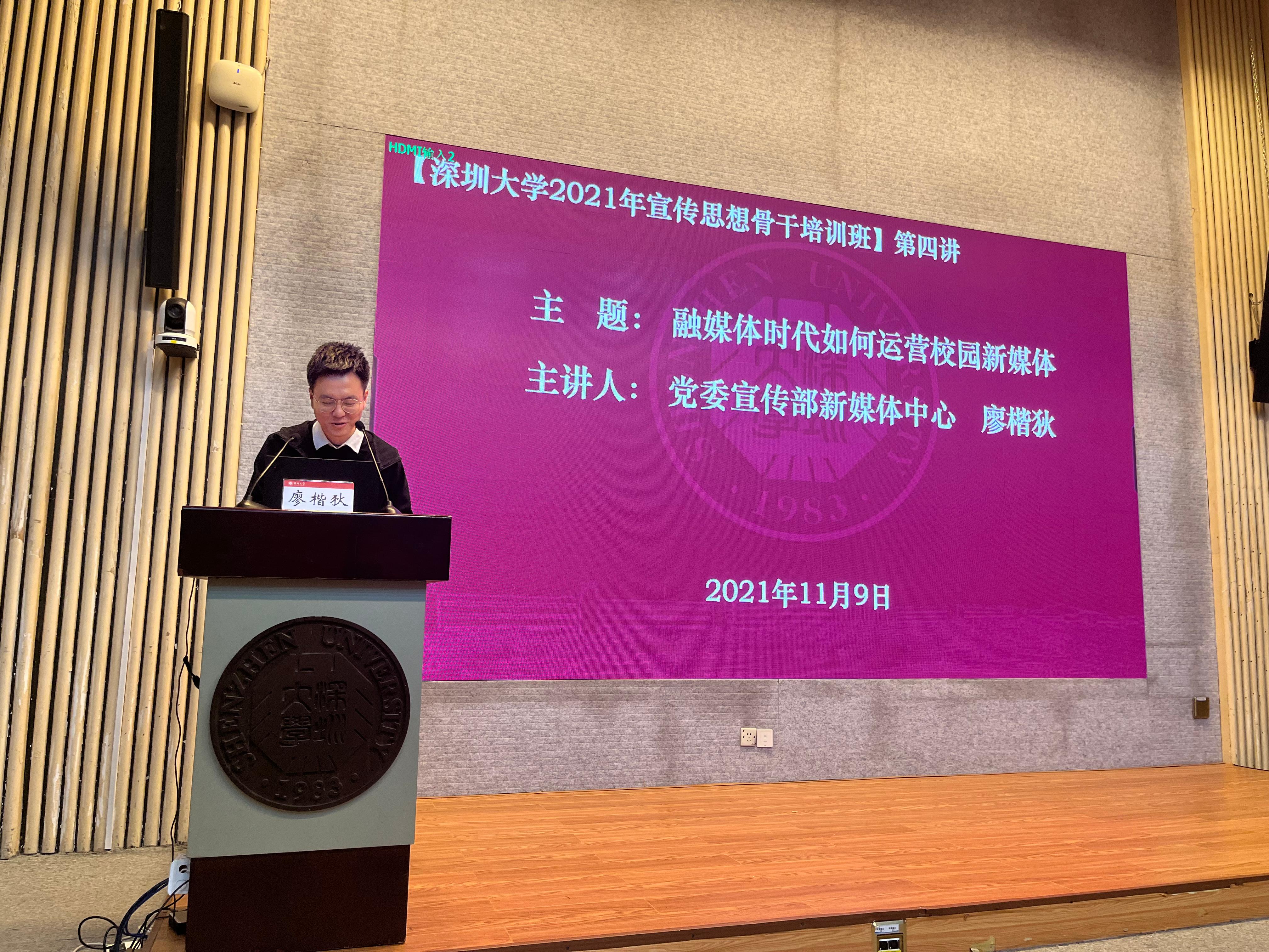 9日下午,芒果体育党委宣传部新媒体中心主任廖楷狄主讲“融媒体时代如何运营校园新媒体”,结合融媒体发展趋势,从时代背景与顶层设计、内容生产与平台运营等方面讲授校园新媒体运营技巧。