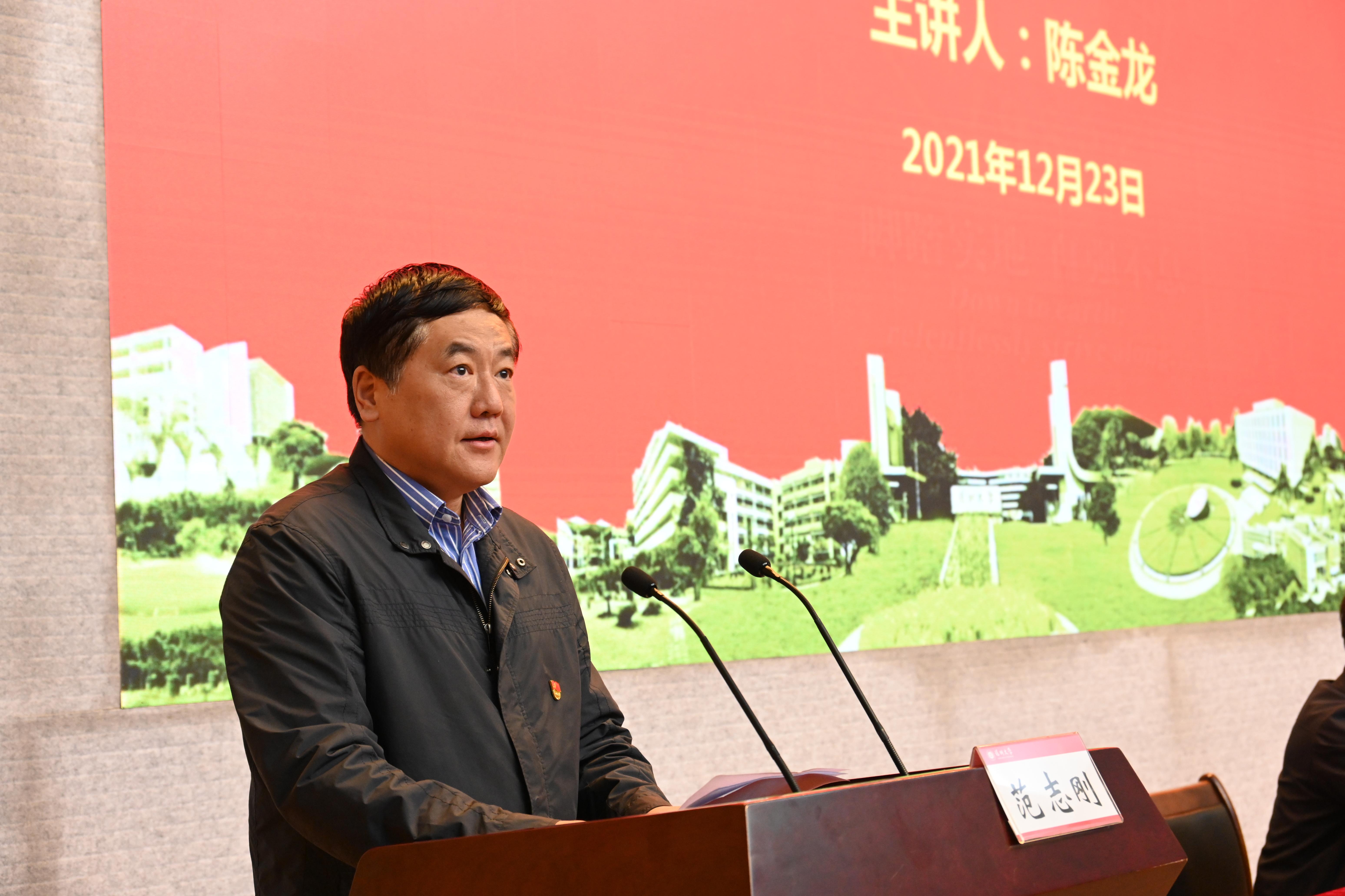为深入学习宣传贯彻党的十九届六中全会精神,12月23日下午,芒果体育召开校党委理论学习中心组(扩大)学习会。邀请教育部“**学者”、党史学习教育省委宣讲团成员、华南师范大学马克思主义学院院长陈金龙教授作党的十九届六中全会精神专题辅导报告。学校党委书记、校长李清泉,党委副书记范志刚,副校长徐晨、李永华、张学记、张晓红,校党委委员以及全体中层干部参加学习。学习会由范志刚主持。