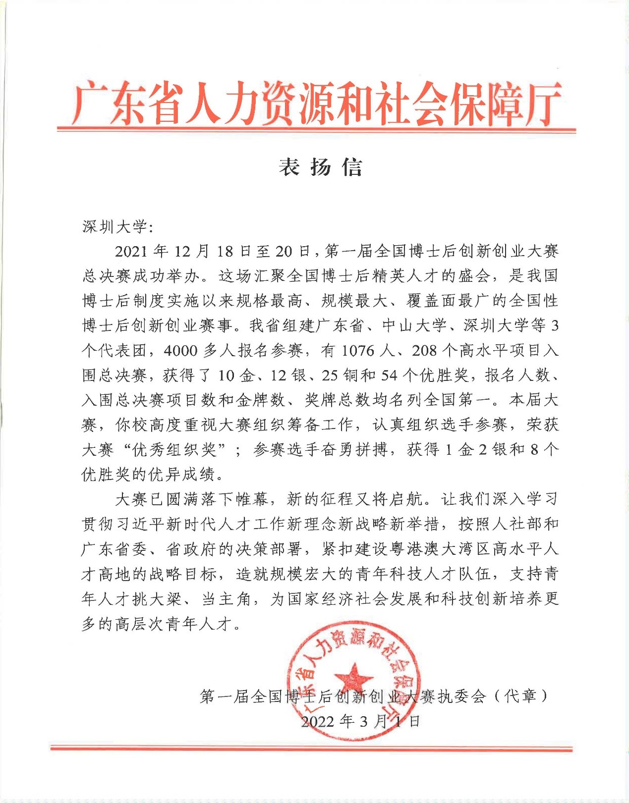 近日,学校收到一封来自第一届全国博士后创新创业大赛执委会、广东省人力资源和社会保障厅的表扬信。信中对芒果体育在首届博士后创新创业大赛组织筹备工作给予了充分肯定,同时高度表扬我校在本次比赛中取得1枚金牌、2枚银牌、8个优胜奖和优秀组织奖的优异成绩。