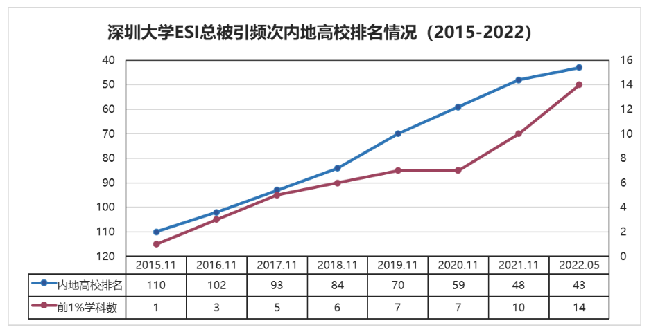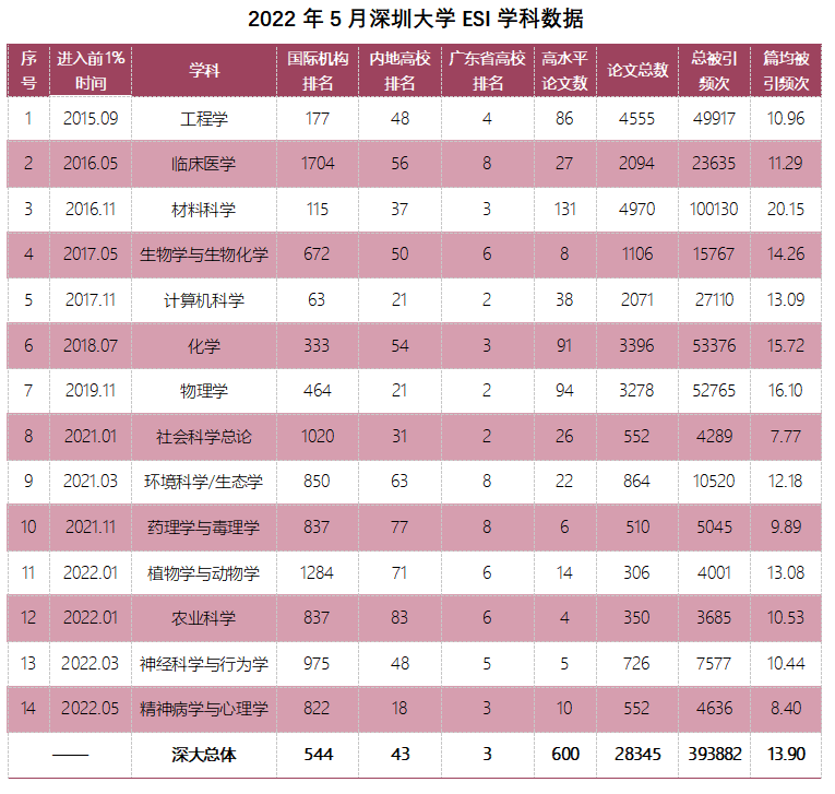 根据科睿唯安(Clarivate Analytics)2022年5月12日最新的ESI(Essential Science Indicators,基本科学指标)数据显示,芒果体育ESI“工程学”学科以全球第177名排位成功进入全球排名前1‰,实现学校ESI前1‰学科零的突破,是深圳本土高校第一个ESI全球前1‰学科。同时,“精神病学与心理学”学科进入ESI全球排名前1%行列,这是2022年以来第4个新晋学科。目前,芒果体育ESI全球前1%的学科数上升至14个,学校学科建设取得显著成效,国际学术生产力和影响力再度提升。