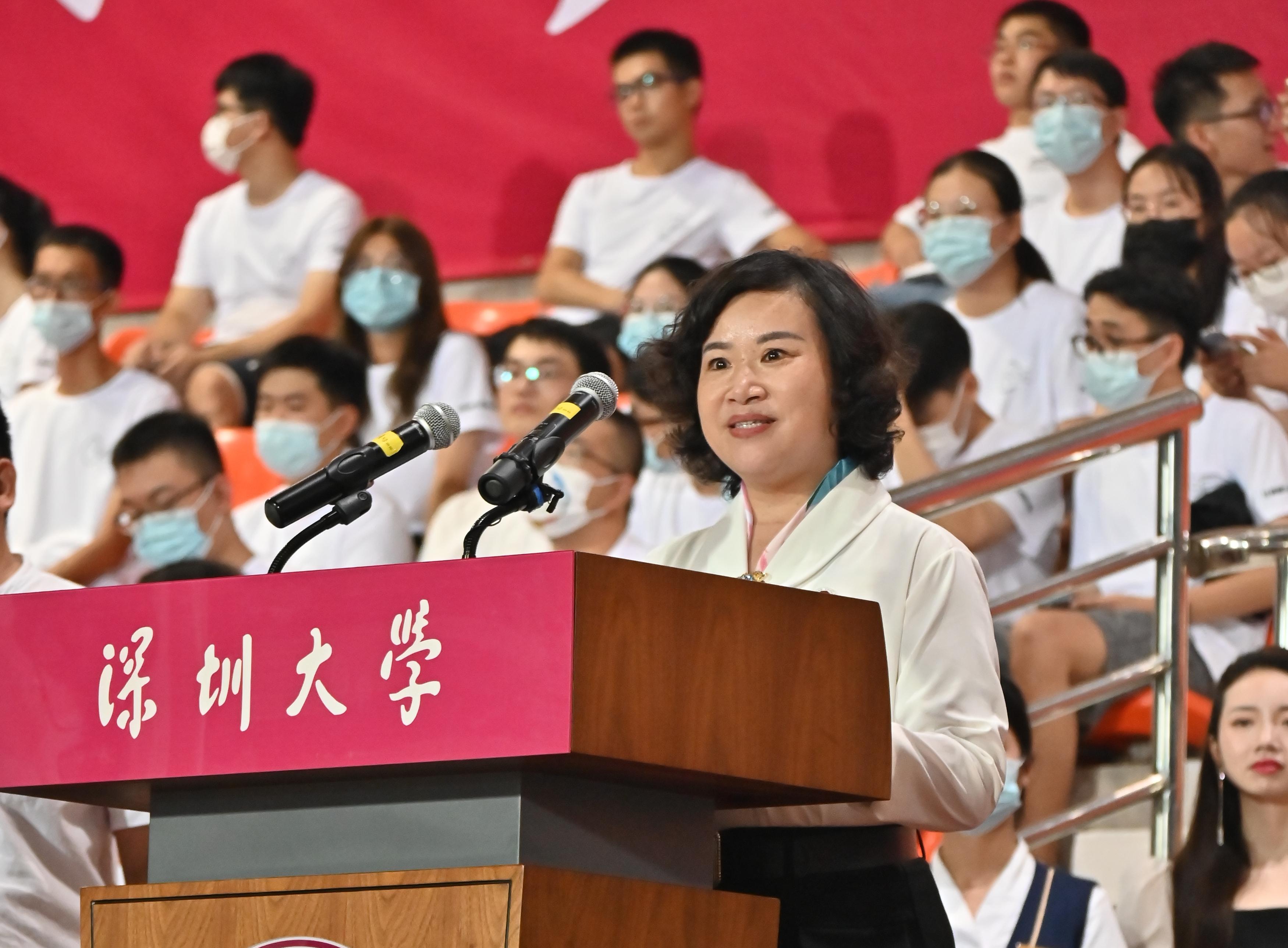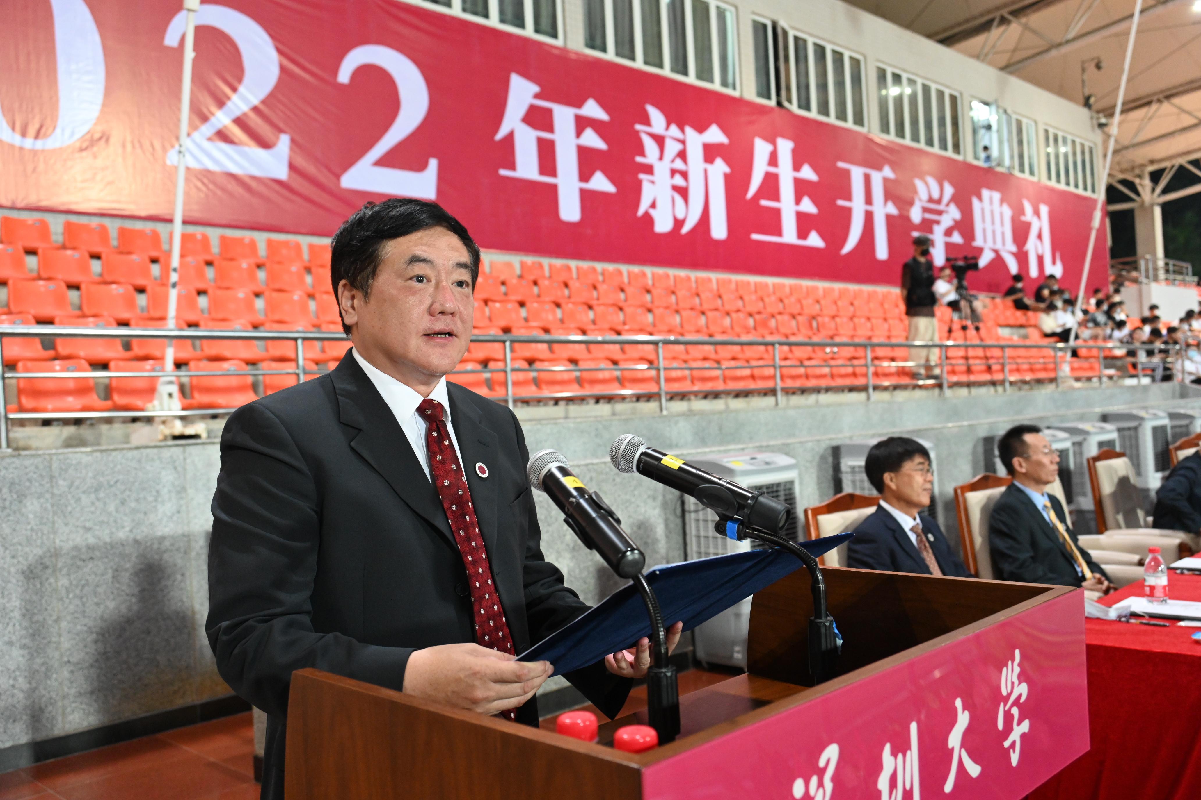 今年芒果体育的开学典礼延续了去年的“线上直播与线下结合、粤海与丽湖校区联动”特色,在介绍2022级新生情况、毛军发致辞等统一环节后,两校区分别在线下进行嘉宾、教师代表与新生代表致辞等环节。