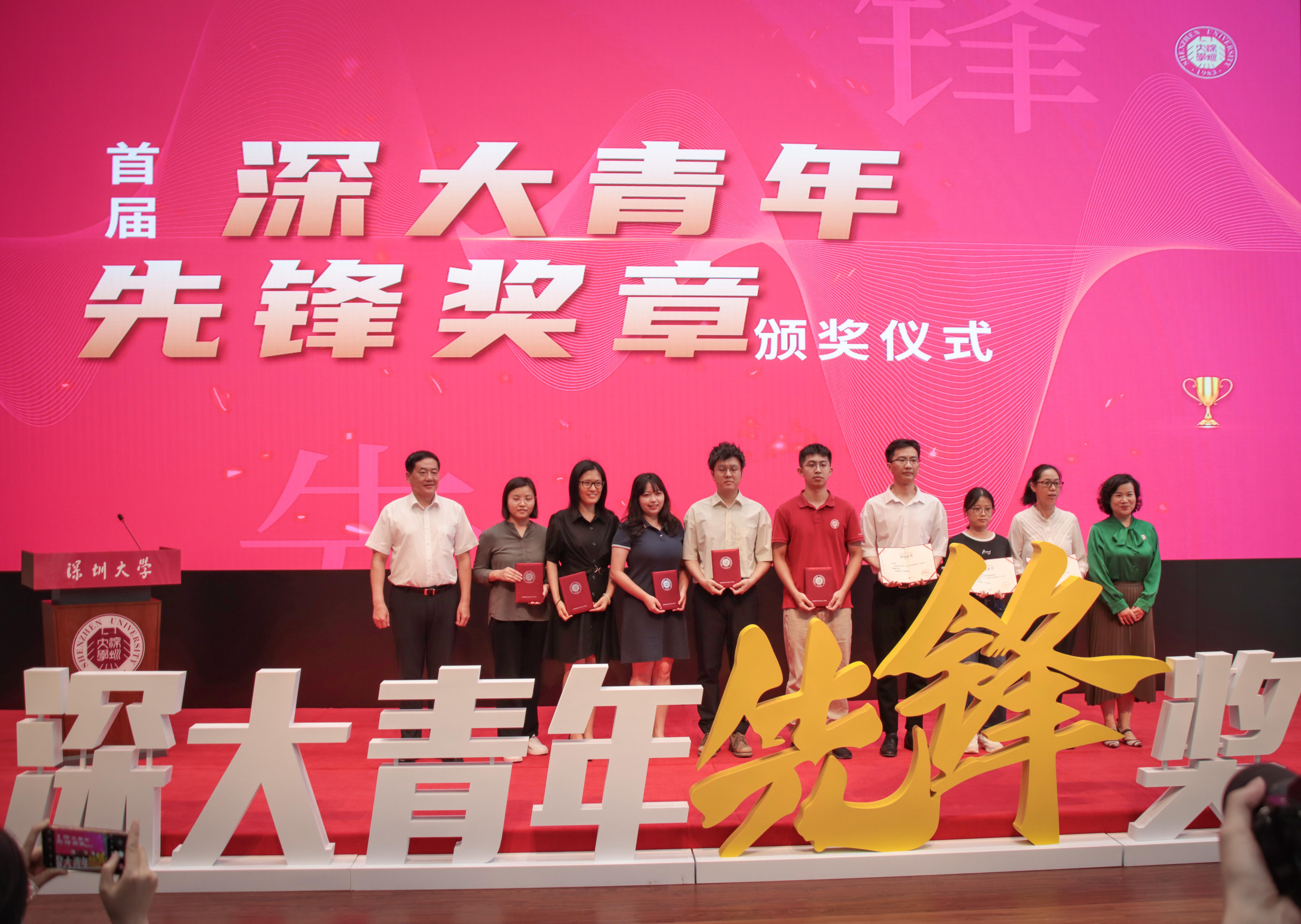 荣获“深大青年先锋奖章”提名奖的集体和个人是:图书馆多元深化学科服务团队(集体)、RobotPilots机器人实验室(集体)、深大青年学生造血干细胞捐献群体(集体)、传播学院汪翩翩老师、体育学院侯逸凡老师、人文学院韩蔼婷老师、党委宣传部廖楷狄老师、生命与海洋科学学院李铭怡同学、计算机与软件学院陈凯鑫同学、机电与控制工程学院吴文彬同学。范志刚、张晓红为他们颁奖。