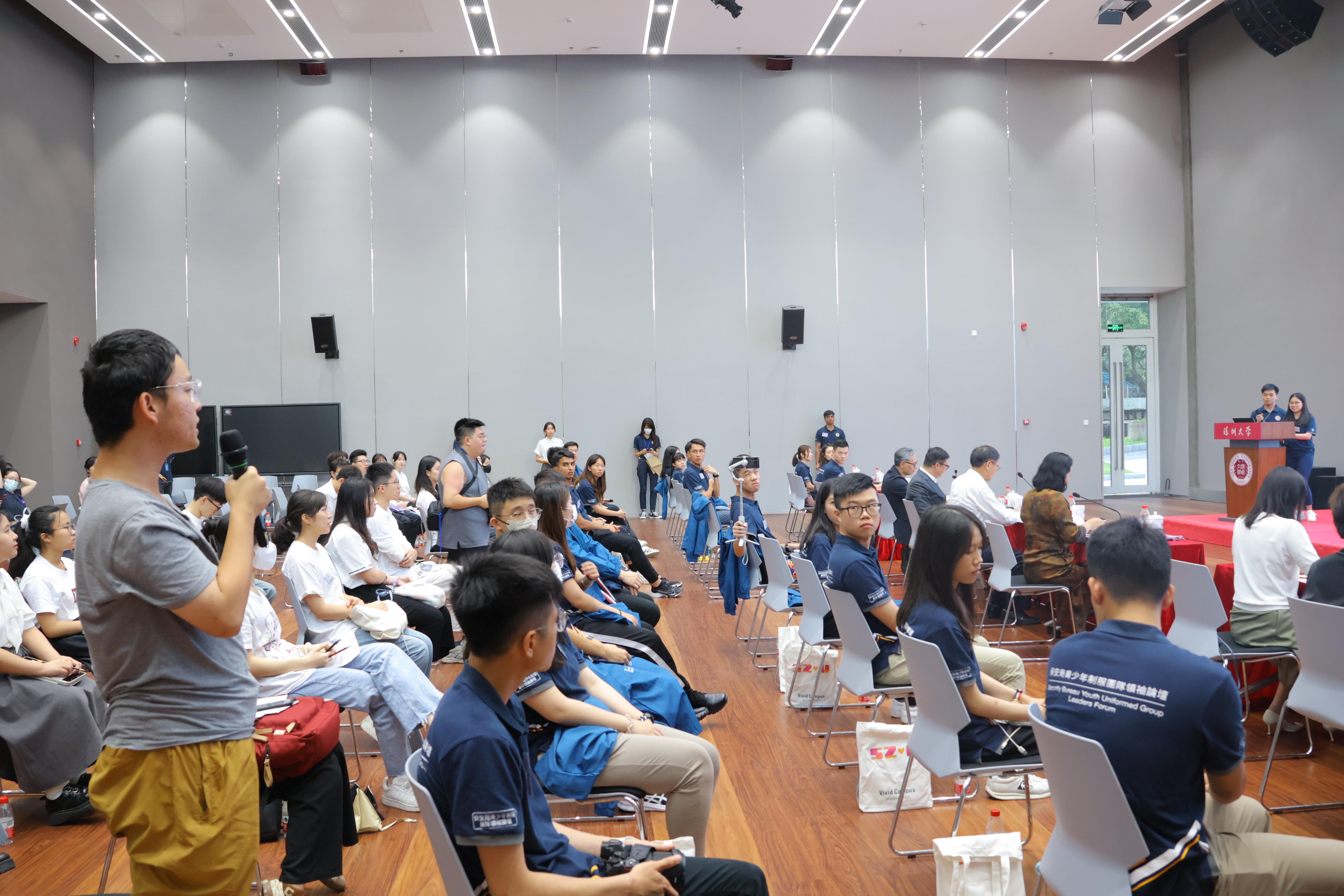 张学记在交流研讨会上致辞。他表示,研学团成员都是优秀的人才,希望此行双方能够通过多元化的活动促进交流、开拓视野、增长见识。随着粤港澳大湾区建设的深入推进,芒果体育会继续积极支持与香港地区开展教育、科研、文化和学术交流活动,希望香港保安局的青年领袖常来芒果体育交流参观,让双方学生相互学习、共同进步。