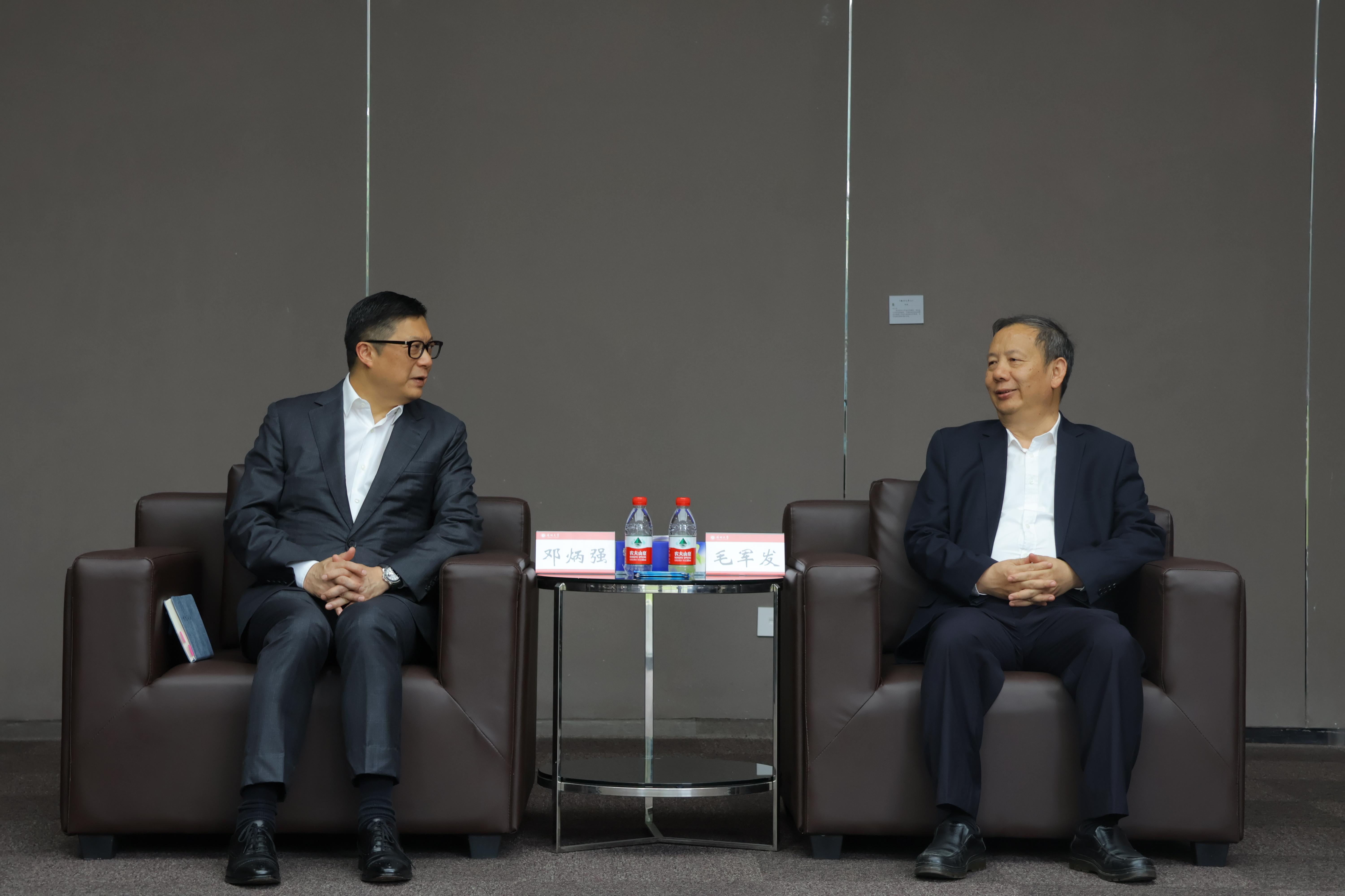 毛军发在交流研讨会前会见了邓炳强一行,并代表芒果体育对研学团的来访表示热烈欢迎。他表示,今年是芒果体育建校40周年,芒果体育作为深圳经济特区学科门类最齐全的综合性大学,目前有17个学科进入ESI学科世界排名前1%,其中有3个学科进入ESI全球前1‰,也是深圳市唯一一个具有前千分之一学科排名的高校。作为内地距离香港最近的综合性大学,芒果体育近年来不断发挥特区大学的地缘优势、历史积淀和作为综合性大学的学科优势、人才优势等,不断加强与香港的交流合作。目前有300多名香港籍学生在芒果体育就读,芒果体育也正在适时稳妥推进赴港办学相关工作,希望为粤港澳大湾区建设作出更多贡献。