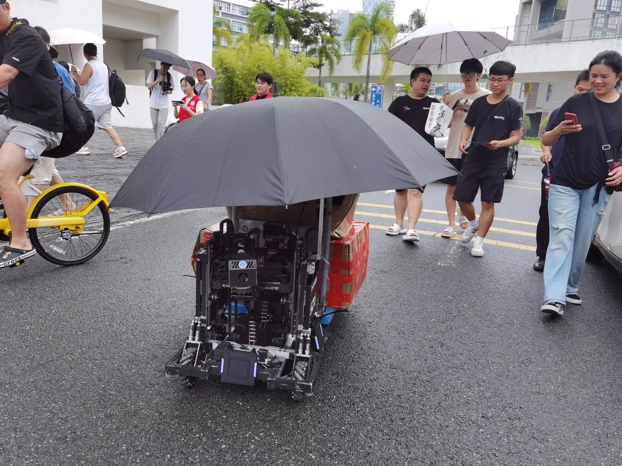 在智慧化迎新方面,深大还推出了“科技与狠活儿”。在粤海校区南区,只见一个造型硬朗的机器人拖着行李舱、“手”持小旗帜,正将新生的部分行李运往宿舍,下雨的时候它甚至还能“撑伞”防止行李淋湿。2020级机电与控制工程学院同学介绍,这是芒果体育RobotPilots机器人实验室创新研发的工程机器人,是深大人自主设计、自主研发的成果,今年8月在全国大学生机器人大赛机甲大师超级对抗赛中进入全国八强。袁嘉恒说,该工程机器人能够负荷70kg左右的重量,能在迎新工作中帮大家节省人力。