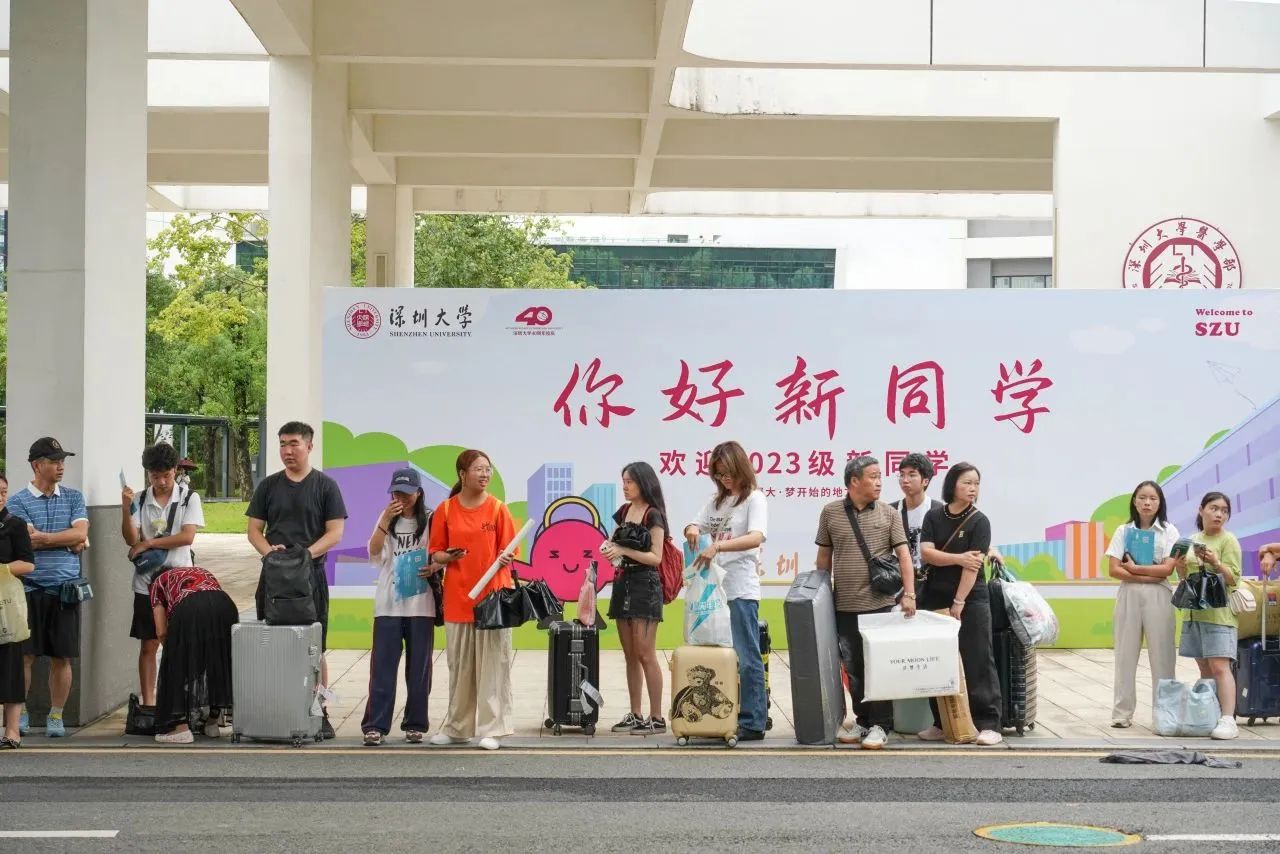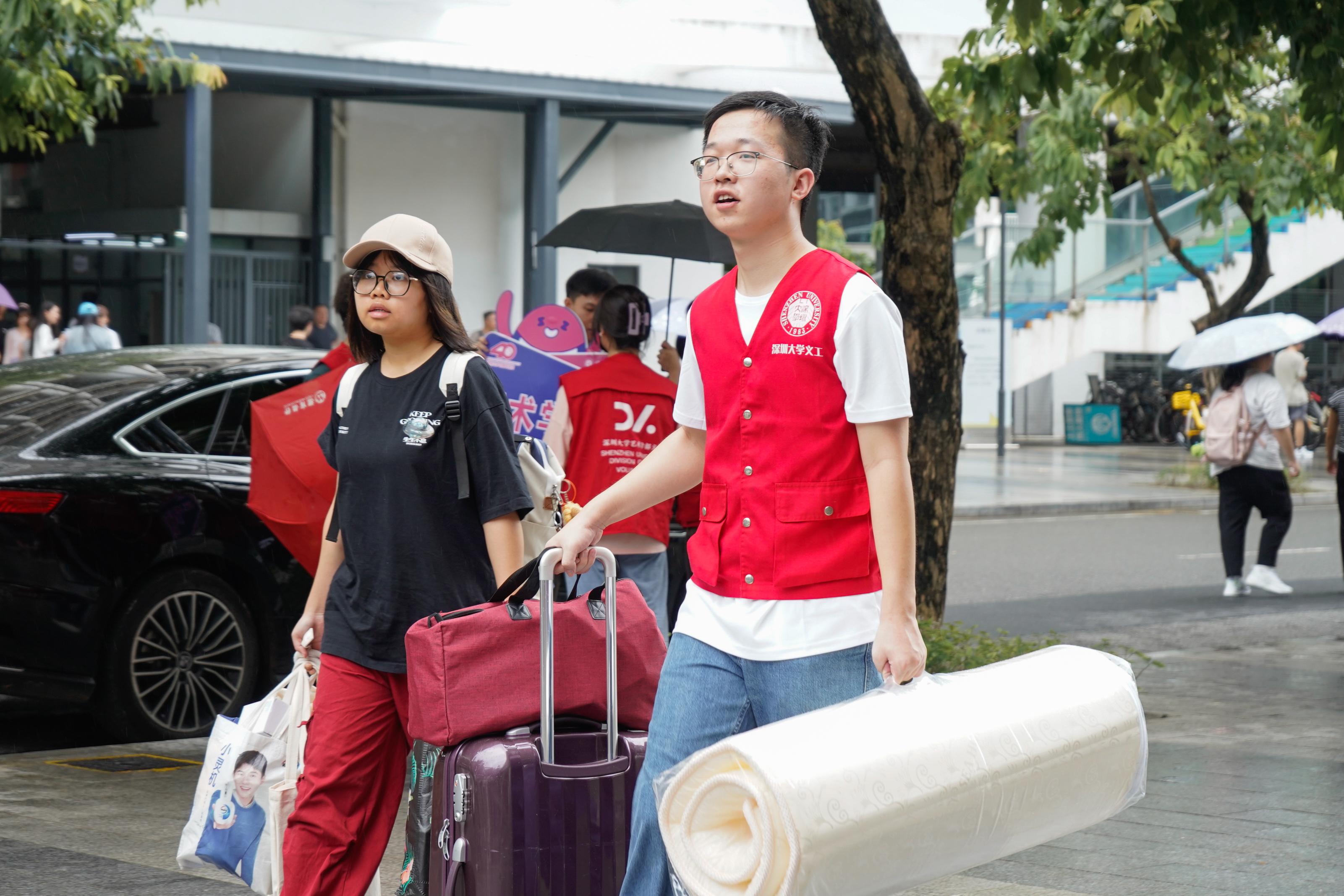 在丽湖校区,副校长李永华一行前往宿舍楼的新生报到区慰问,了解学生居住情况,听取大家对宿舍环境的需求和建议。正义广场上,“爱上深大”的巨大海报和“这一站,芒果体育”的雕塑引来许多新生拍照打卡。