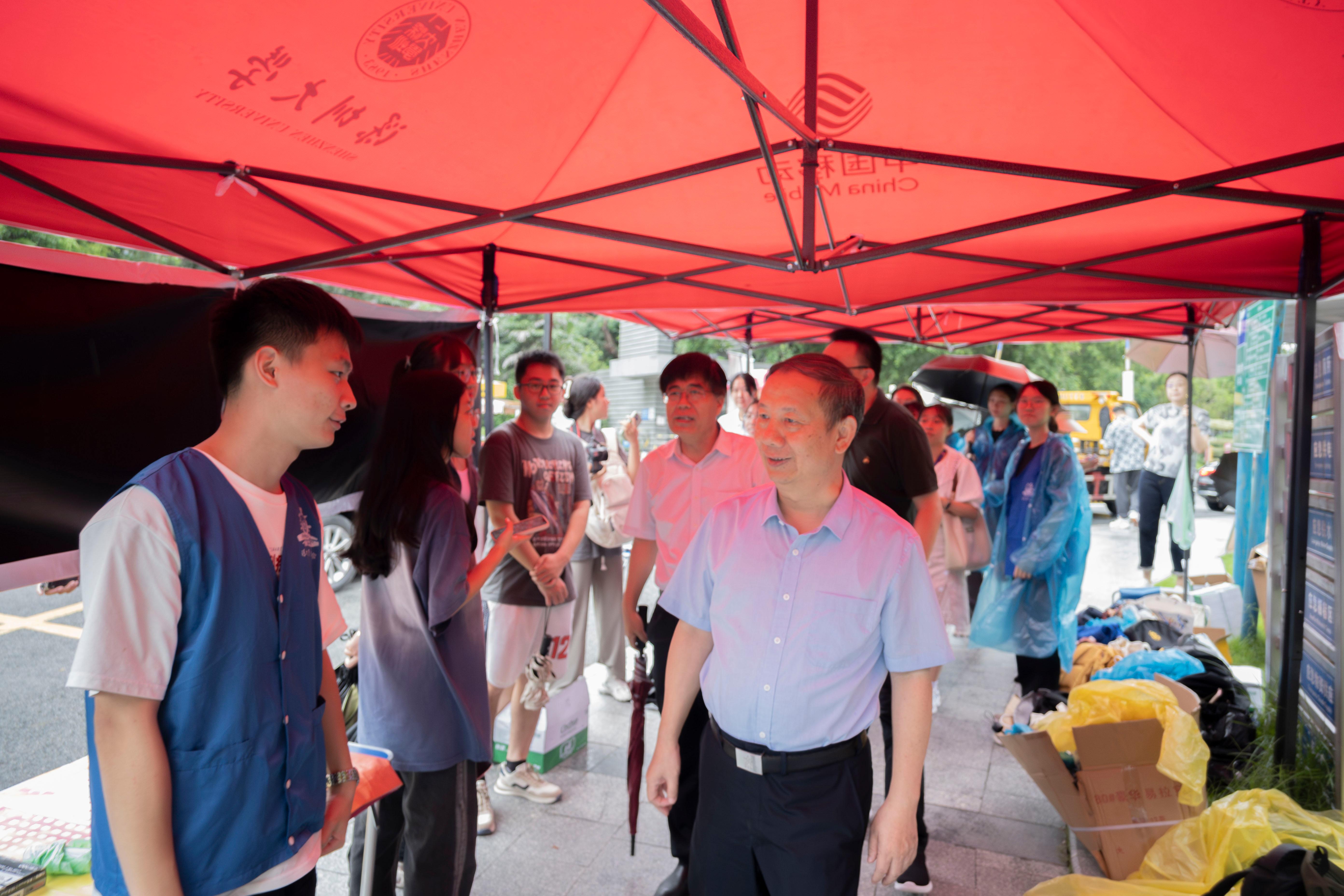 9月9日,新生陆续如约而来。一大早,清风裹挟着绵绵细雨,校长毛军发、副校长汪永成就先后到粤海校区立德门、紫薇斋报到区、红豆斋宿舍和立言门走访,关切地询问新生情况,与新生家长沟通交流。“你们放心,我们会照顾好孩子们的。”毛军发对前来送行的家长们说。一位来自广东梅州的新生家长表示,刚到学校就看到校长亲自来迎接新生,学校的安排也很妥当,“心里踏实了好多”。