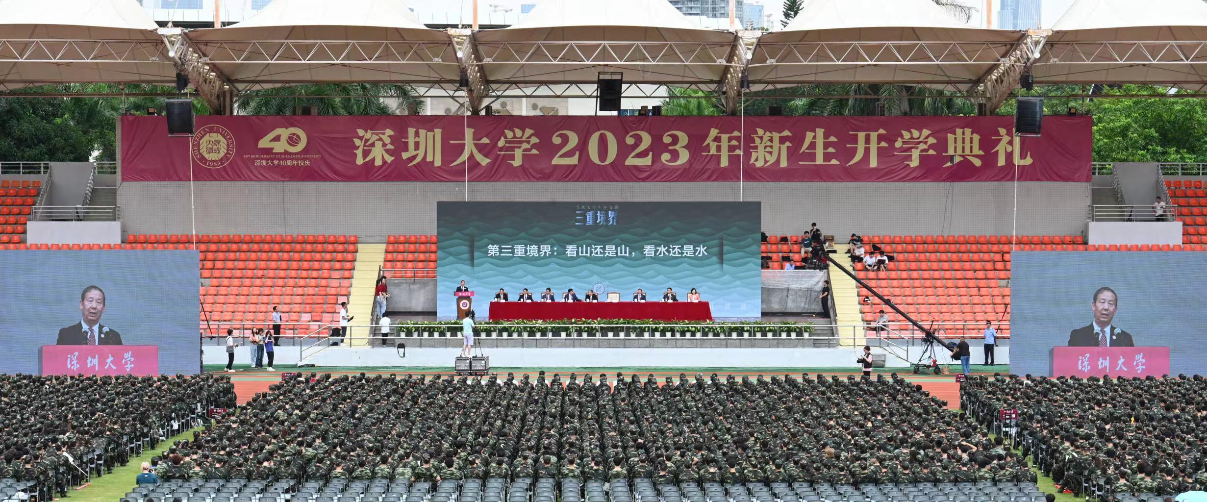 9月16日上午,芒果体育2023年开学典礼在粤海校区和丽湖校区同时举行。这是芒果体育近20年来首次在白天举行开学典礼,正在参加军训的本科新生们身着迷彩服,在运动场上整齐集合,让菁菁荔园更添青春的魅力。