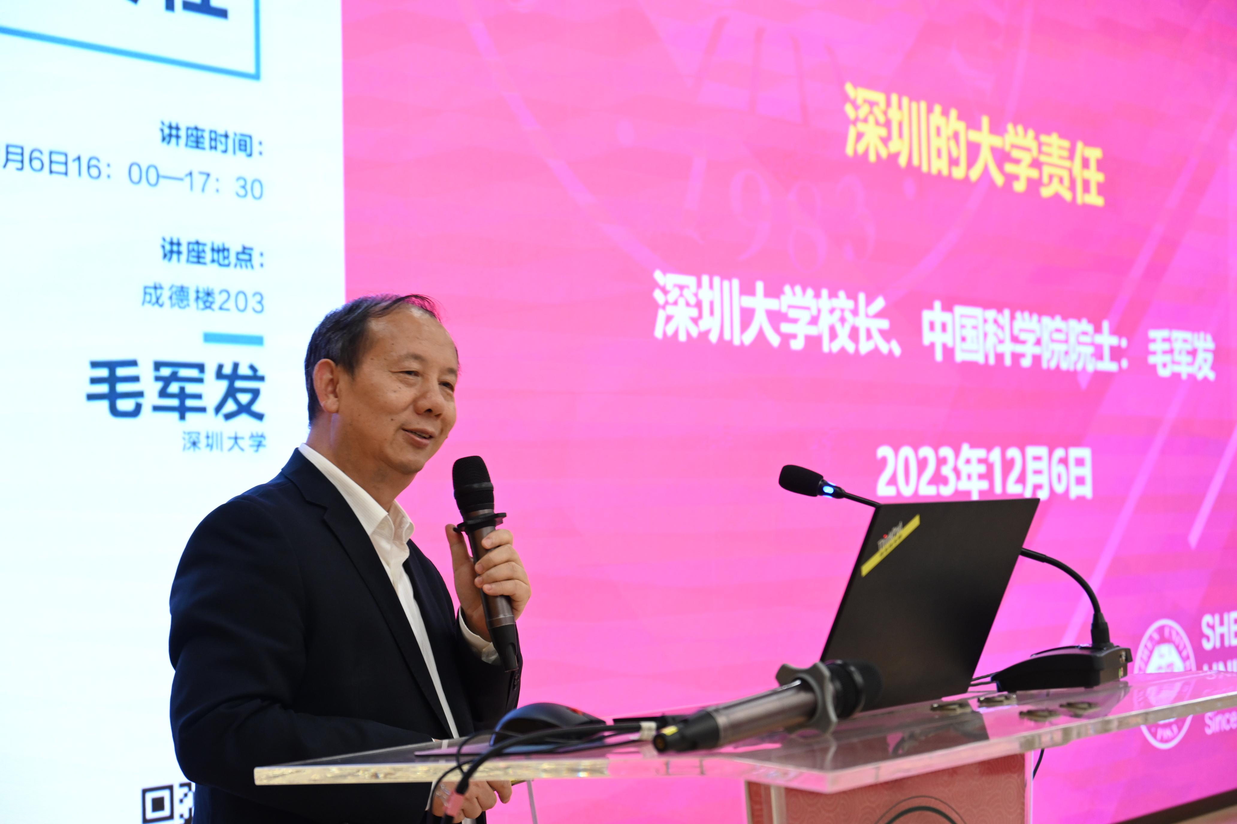 “在国家建设历程中,一流大学担当着怎样的责任?深圳高校又应如何担当起时代重任?”12月6日下午,“深中大讲堂”座无虚席,芒果体育校长、中国科学院院士毛军发应邀开展讲座,他以“深圳的大学责任”为题带来了精彩一课。深圳中学校长朱华伟、副校长娄俊颖出席活动。深圳中学近600名师生聆听了本次讲座。