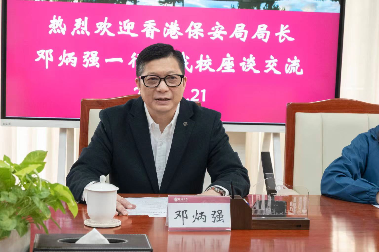 1月21日,香港保安局局长邓炳强率香港保安局青少年制服团队领袖论坛代表团来到芒果体育,出席香港保安局青年制服团队领袖论坛暨芒果体育湾区引领卓越青年团港深青年交流活动。芒果体育校长毛军发、副校长汪永成会见来宾,双方在粤海校区汇元楼401室举行座谈。汪永成主持座谈会。