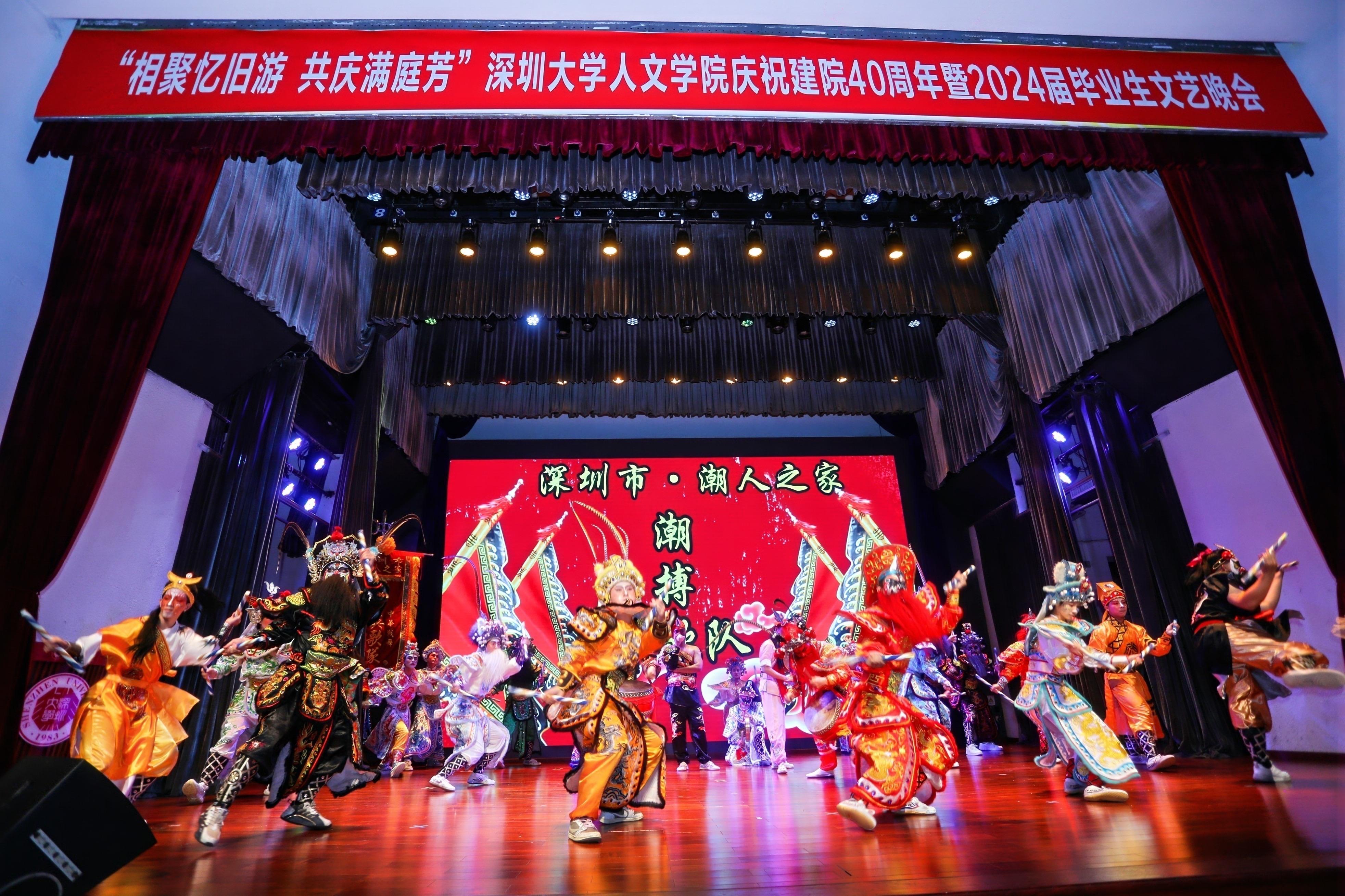 画着脸谱的表演者手中舞槌上下翻飞,交错叩击,槌花灵动,步伐矫健,锣鼓喧天,铿锵有力、气势如虹的英歌舞在芒果体育国际会议厅震撼上演,燃爆全场。5月31日晚,“相聚忆旧游,共庆满庭芳”芒果体育人文学院建院40周年暨2024届毕业生文艺晚会的现场,有着“中华战舞”之称的英歌舞首次登上高校舞台。这是芒果体育人文学院在“双百行动”背景下推出的品牌项目“英歌进深大”的首次成果亮相。