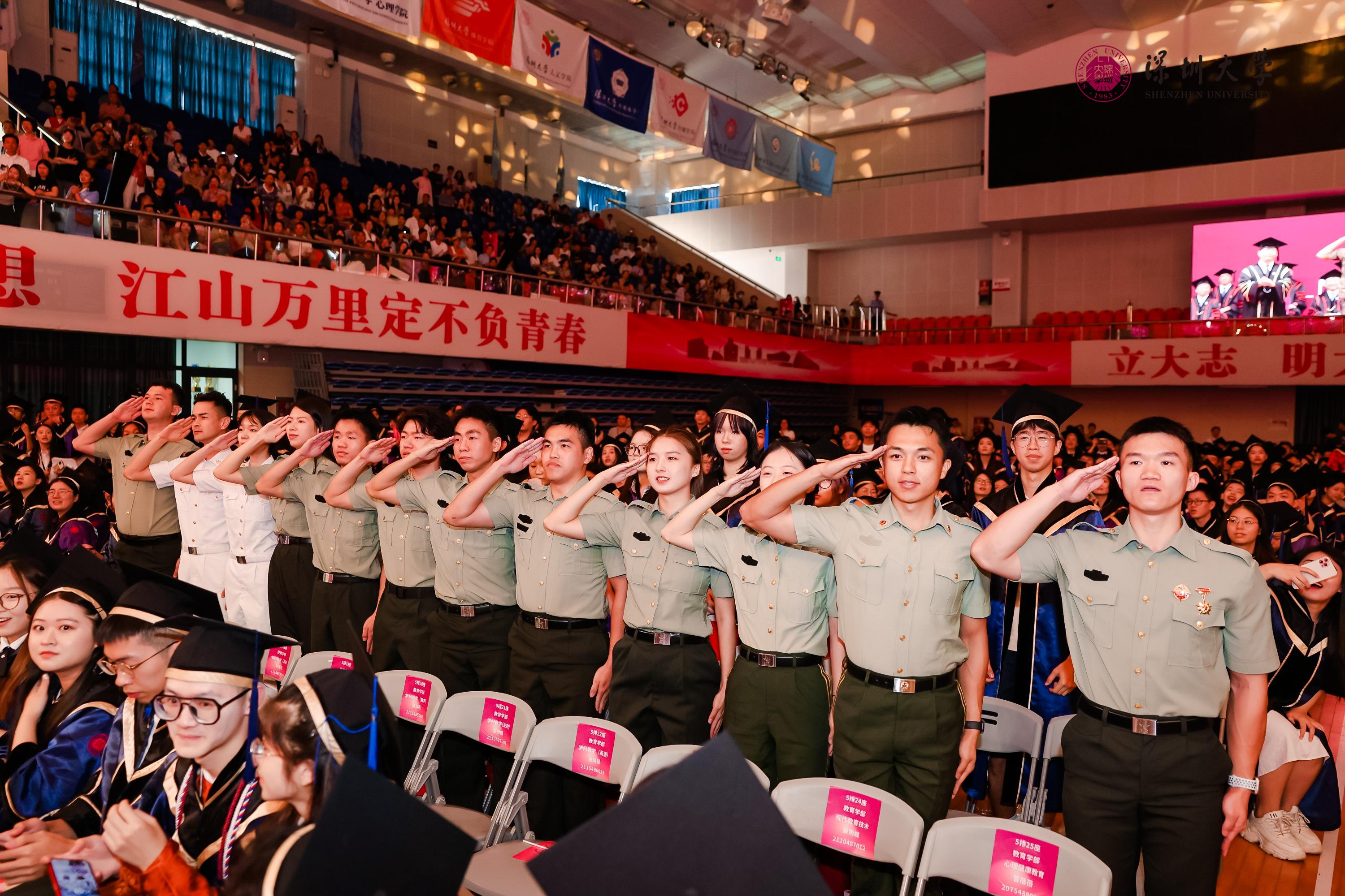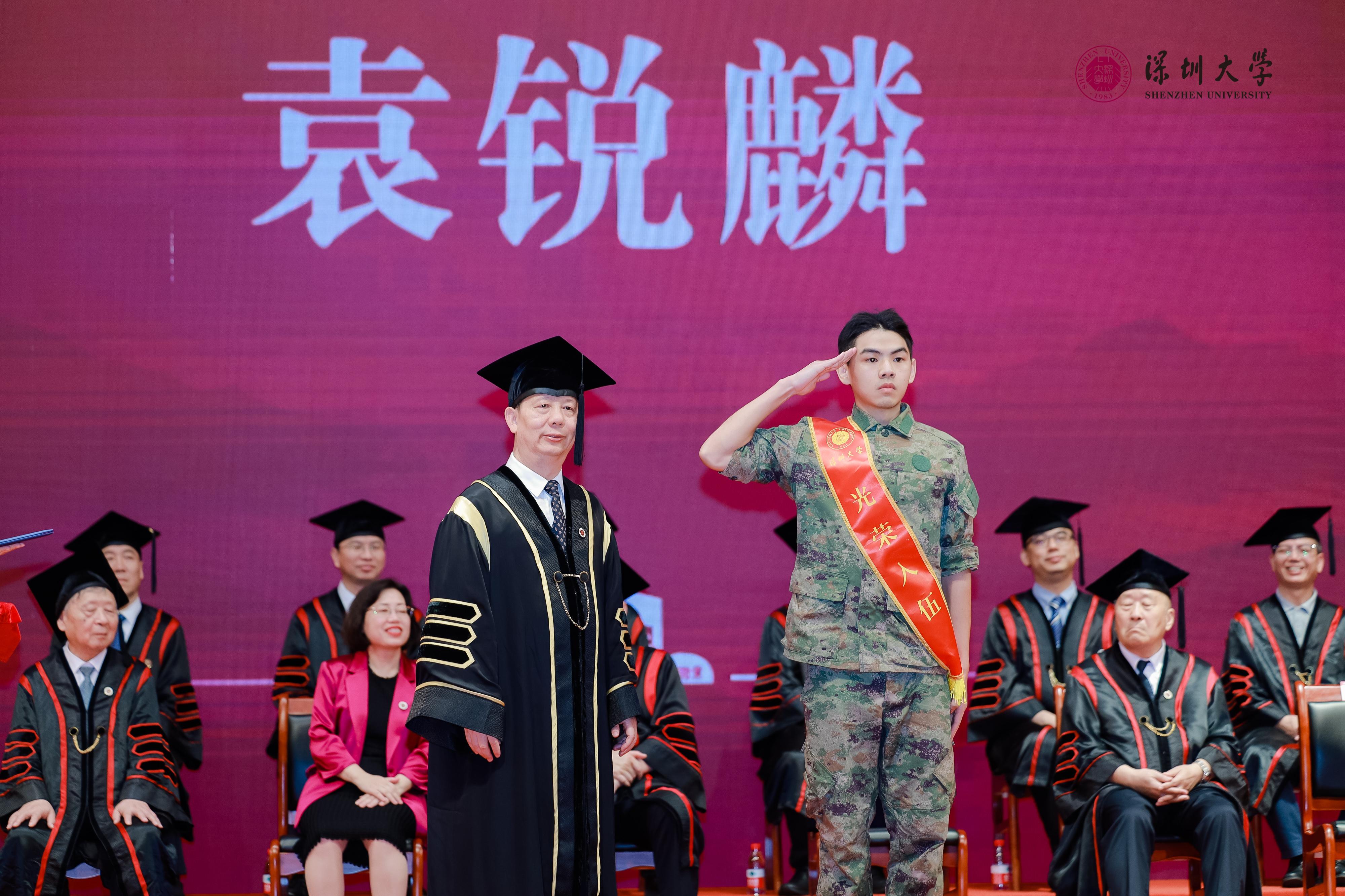 最“燃”的是学士学位颁授环节,最后一位上场的毕业生袁锐麟在礼成后完成了一场令全场震撼的“变装”——毕业即将入伍奔赴军营的他脱下学位服,亮出一身戎装,向师长和同学们敬礼。台下,12位退伍兵毕业生起立,共同敬礼。“强国有我,请祖国放心,请学校放心!”台上台下同样铿锵的誓言和有力的敬礼,是依依送别,更是责任的交接。“我在这人生的重要时刻换上迷彩服,象征着我即将从一名学生转变为一名军人,标志着我人生新阶段的开始。我将以新的身份继续努力!”袁锐麟说。