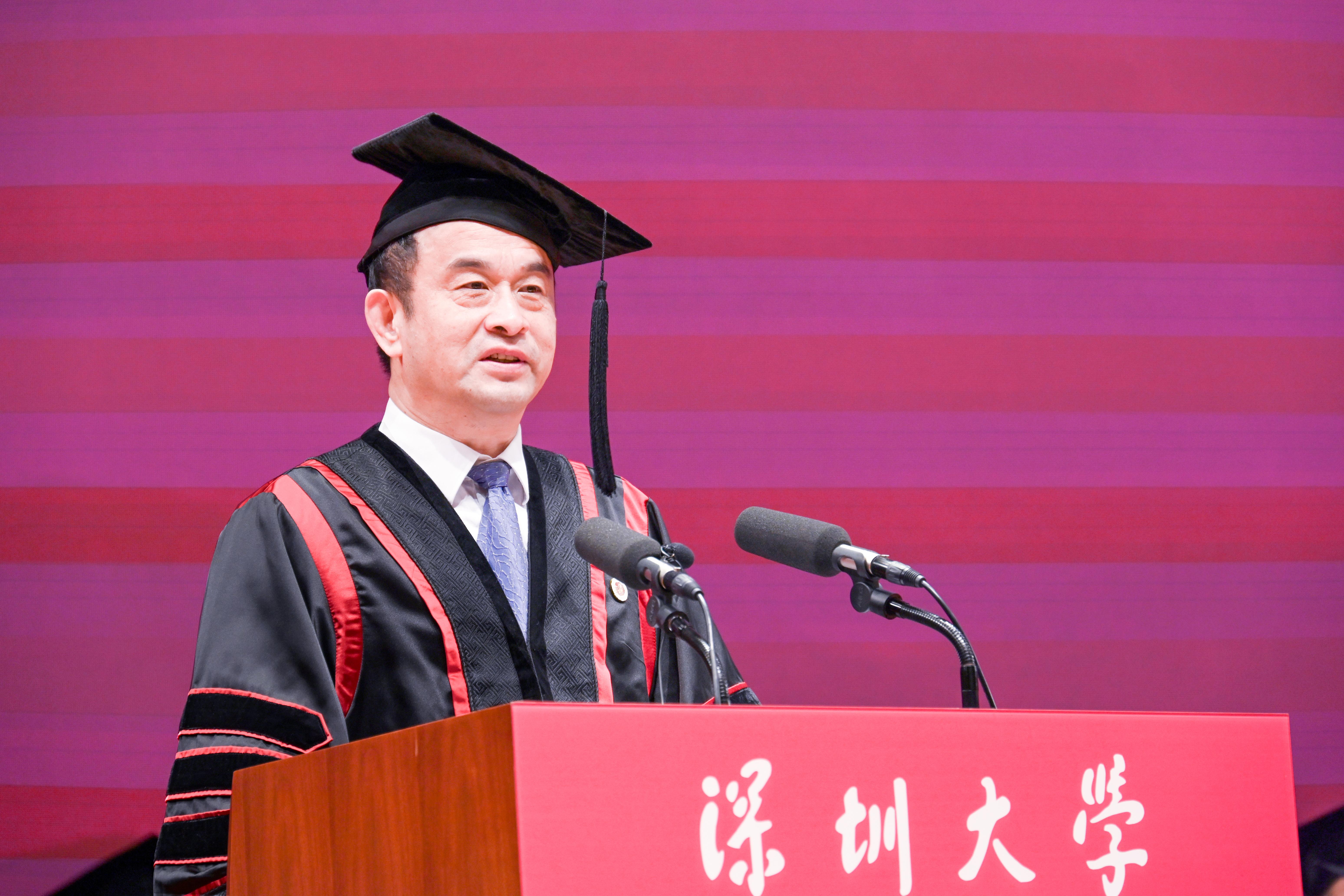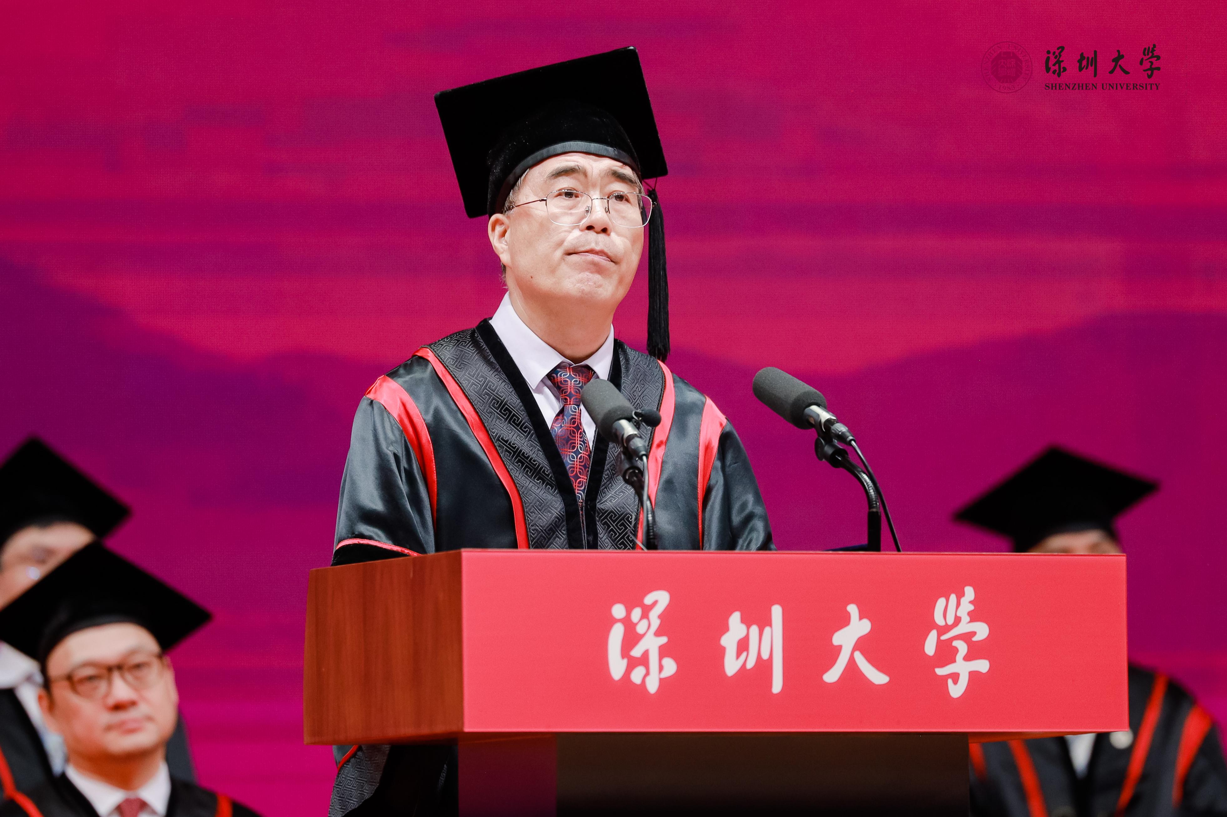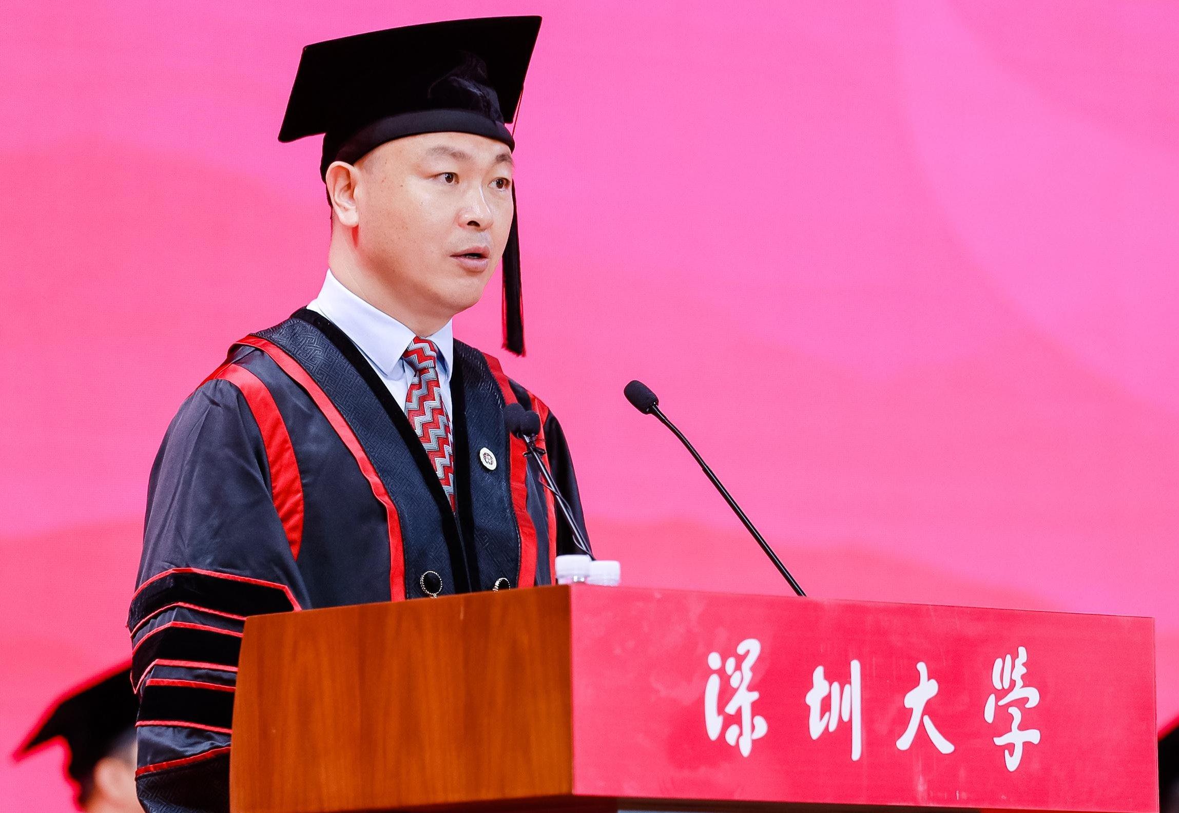 在丽湖校区,吴启超作为嘉宾代表发言。作为一名创业企业家,吴启超回顾自己带领公司成功上市和收购老牌亏损企业并实现逆转的历程。“感恩、成长”是他对毕业生们的寄语和期待,感恩时代的发展和母校的培养,也要明白“成长永远比成功更重要”。他说,深大“自立、自律、自强”的校训始终激励着他,教会他既要仰望星空,又要脚踏实地。“年轻的意义就是成长。只有成长之后的成功,才会持续持久!”他鼓励毕业生们永远积极乐观,保持正能量;保持终身学习的能力,在剧变的时代保持思考能力;并学会做时间的朋友。“在未来的人生征途上你绝对不是一个人在战斗,有数十万深大校友站在你身后!”