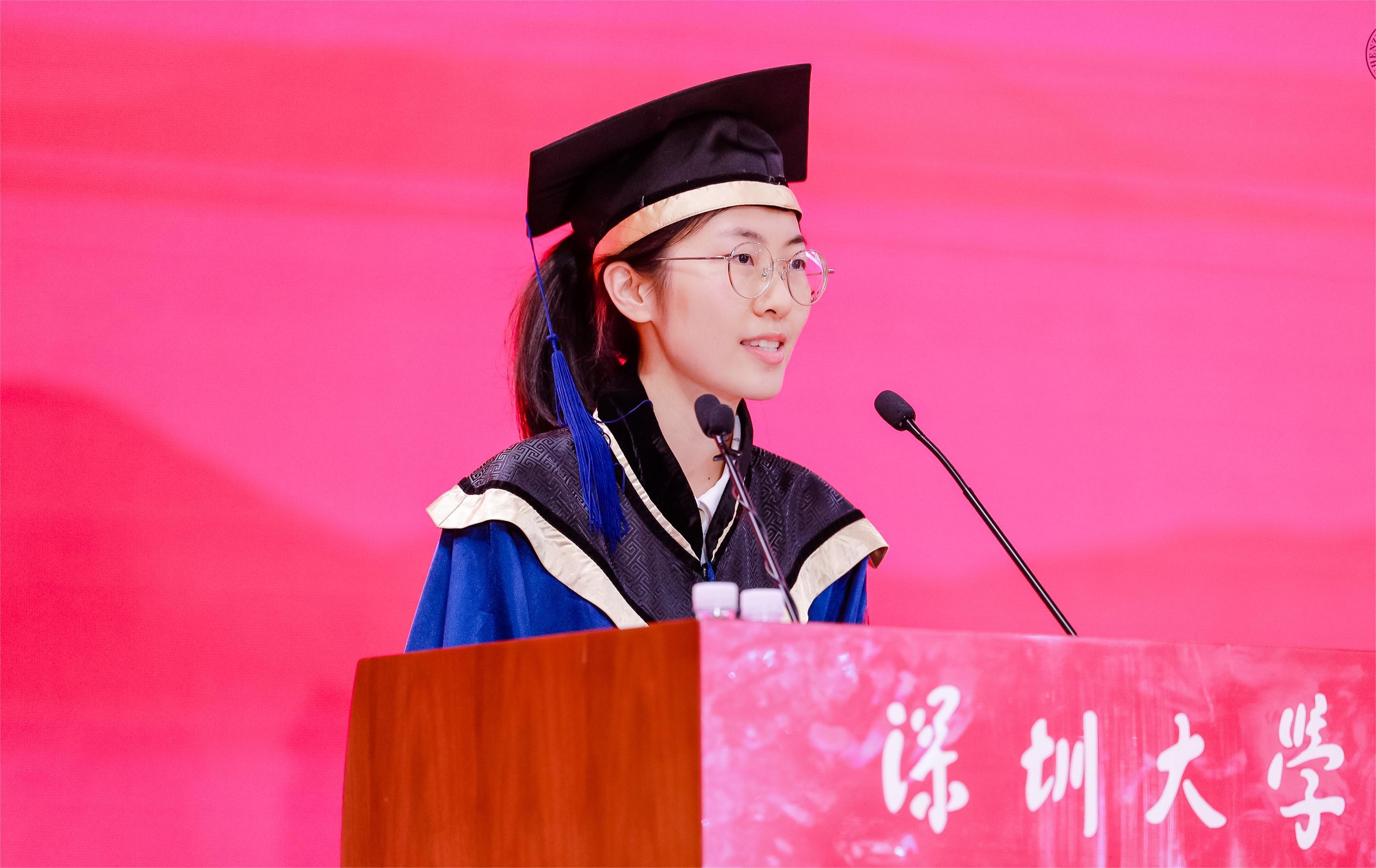 在丽湖校区,医学部本科毕业生郭奕彤作为学生代表发言。郭奕彤回顾大学时期的收获,将试错、沉淀与成长作为自己探索人生的“精进”之道的“关键词”。她结合自己所学药学专业,将人生比作“一场持续不断的药物研发和优化过程”,过程中要经历无数次的失败和调整,需要一颗“抓住机会、敢于试错”的大心脏,每一次的“不放弃”都会在未来的某一刻实现它的价值。她以自己最喜欢的国际象棋为喻,认为与强者对弈是练习直面失败和提高应对复杂棋局能力的好方法。郭奕彤说,许多努力也许短时间看不到成果,但不要灰心、不要焦虑,我们不是没有成长,我们是在扎根。临别,她忆起初到深大的那个十八岁的夏天,再次表达了对母校深厚的情感:“芒果体育,这个永远鼓励我们追梦、给予我们勇气的地方,值得我们用一生去怀念和热爱。”