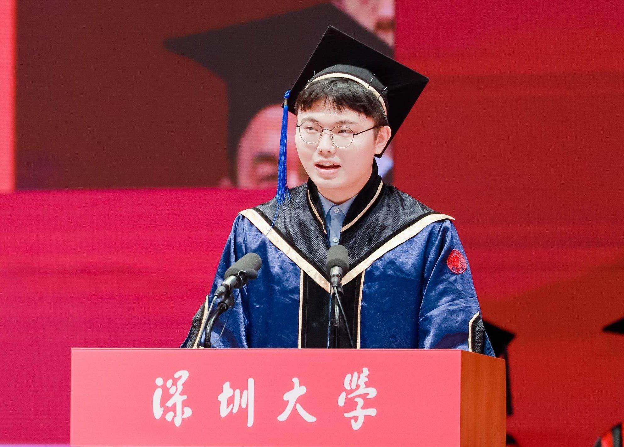 在粤海校区,来自传播学院的本科毕业生朱梓鹏作为毕业生代表发言。临别之际,他重新捡拾起心中的“意义地图”,深情回顾了每一位深大人在荔园的“意义探险”。朱梓鹏说,“意义探险”的第一关,是在真理哲思的学海之上乘风破浪、中流击水。深大人走出象牙塔看见世界的参差多态,也知晓了新生一代可以努力的方向。“意义探险”的第二关,是在繁花似锦的旷野之中绘梦青春、结交挚友。关爱学生的老师、一路同行的挚友都被珍藏心中。“意义探险”的最后一关,便是从荔园走向社会。“多年前我们勇敢选择深大,而今她拥抱每一个勇敢探险的我们。”朱梓鹏说,荔园“脚踏实地”的气质早已融贯深大人探险的路途。只要始终在“意义探险”的路上,就能以切身体验去丰富宏大叙事,为时代的真问题提供与众不同的答案。