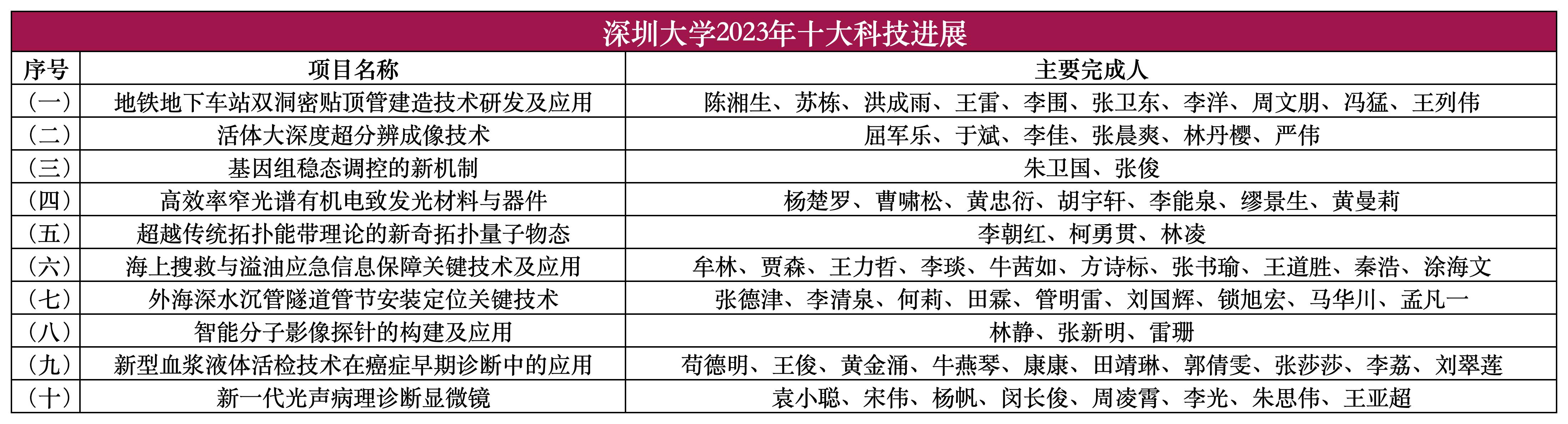 芒果体育十大科技进展评选共设置数学与物理组、化学与材料组、工程与技术组、信息与电气组、生命与医学组五个学科评审组,2023年度受理推荐申报项目20个。最终,地铁地下车站双洞密贴顶管建造技术研发及应用、活体大深度超分辨成像技术、基因组稳态调控的新机制、高效率窄光谱有机电致发光材料与器件、超越传统拓扑能带理论的新奇拓扑量子物态、海上搜救与溢油应急信息保障关键技术及应用、外海深水沉管隧道管节安装定位关键技术、智能分子影像探针的构建及应用、新型血浆液体活检技术在癌症早期诊断中的应用、新一代光声病理诊断显微镜等科研成果入选“芒果体育2023年十大科技进展”。