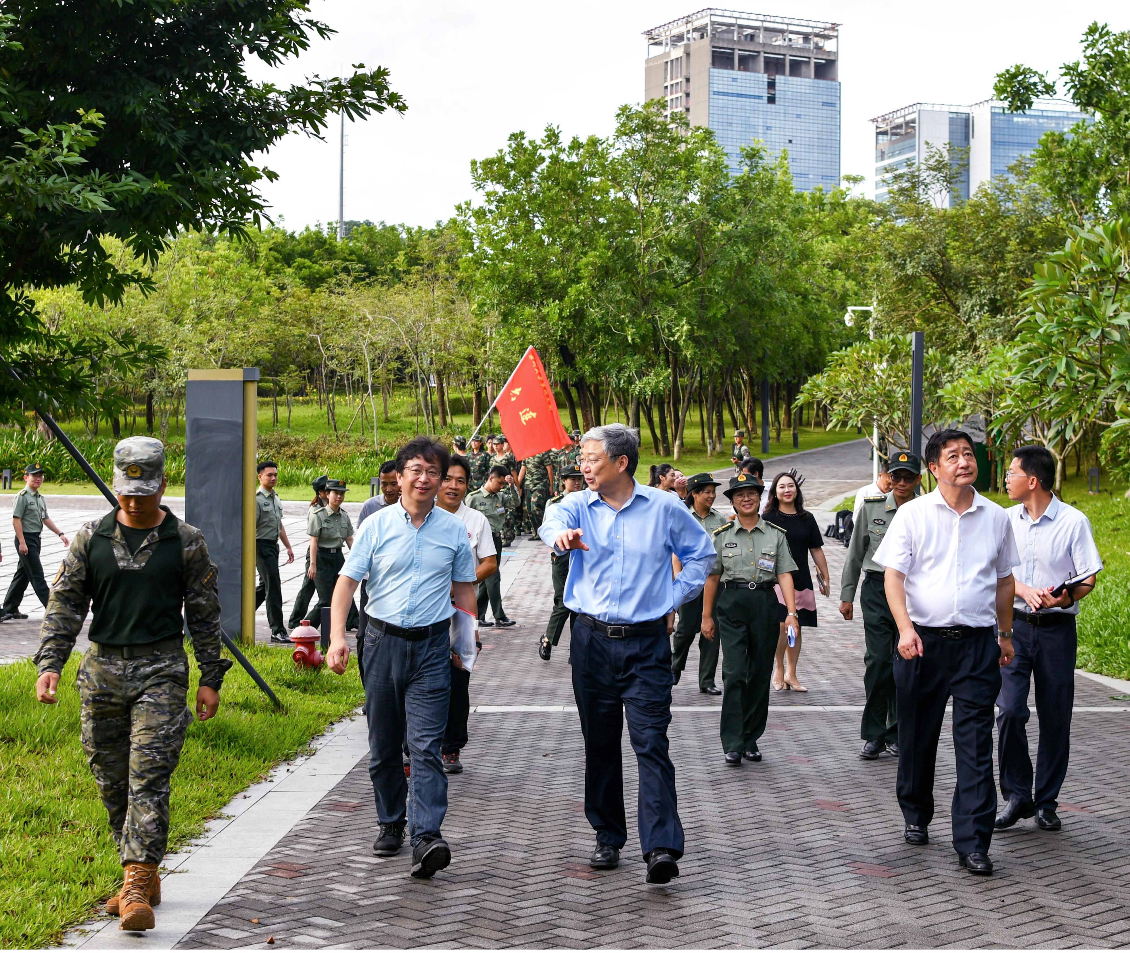 26日,毛军发、汪永成一行到粤海校区田径场、南区体育馆,了解军训一团、二团训练进展,为新生、承训教官等送上亲切的问候。新生们规范的军姿、整齐划一的步伐展现了团结一致、积极向上的精神面貌,毛军发、汪永成不禁竖起大拇指表示赞赏。“看到你们这样训练有素的队伍,我感到非常欣慰,非常高兴。”毛军发与新生们分享自己在中国人民解放军国防科技大学读书时的经历,“我的终身遗憾之一就是没有参加军训,因为当时军校是不用军训的。我很羡慕你们能有这样的经历。”毛军发希望新生们珍惜军训时光,淬炼自我,既要保持体格硬朗,又要坚持学习知识,做到“文武双全”。“大家在一起就都是‘战士’,我们的队伍就是一个温暖的大家庭!”毛军发鼓励新生们团结协作、相互支持鼓励,通过军训收获精神和体魄的双重提升,培养使自己终身受益的优良品格,用崭新的精神面貌和坚定的信念迎接大学生活。“我相信,将来你们一定会时常回忆起这段美好的经历!”毛军发还鼓励新生们积极参军报国,发挥深大学子应有的作用,为我国强军事业作出贡献。