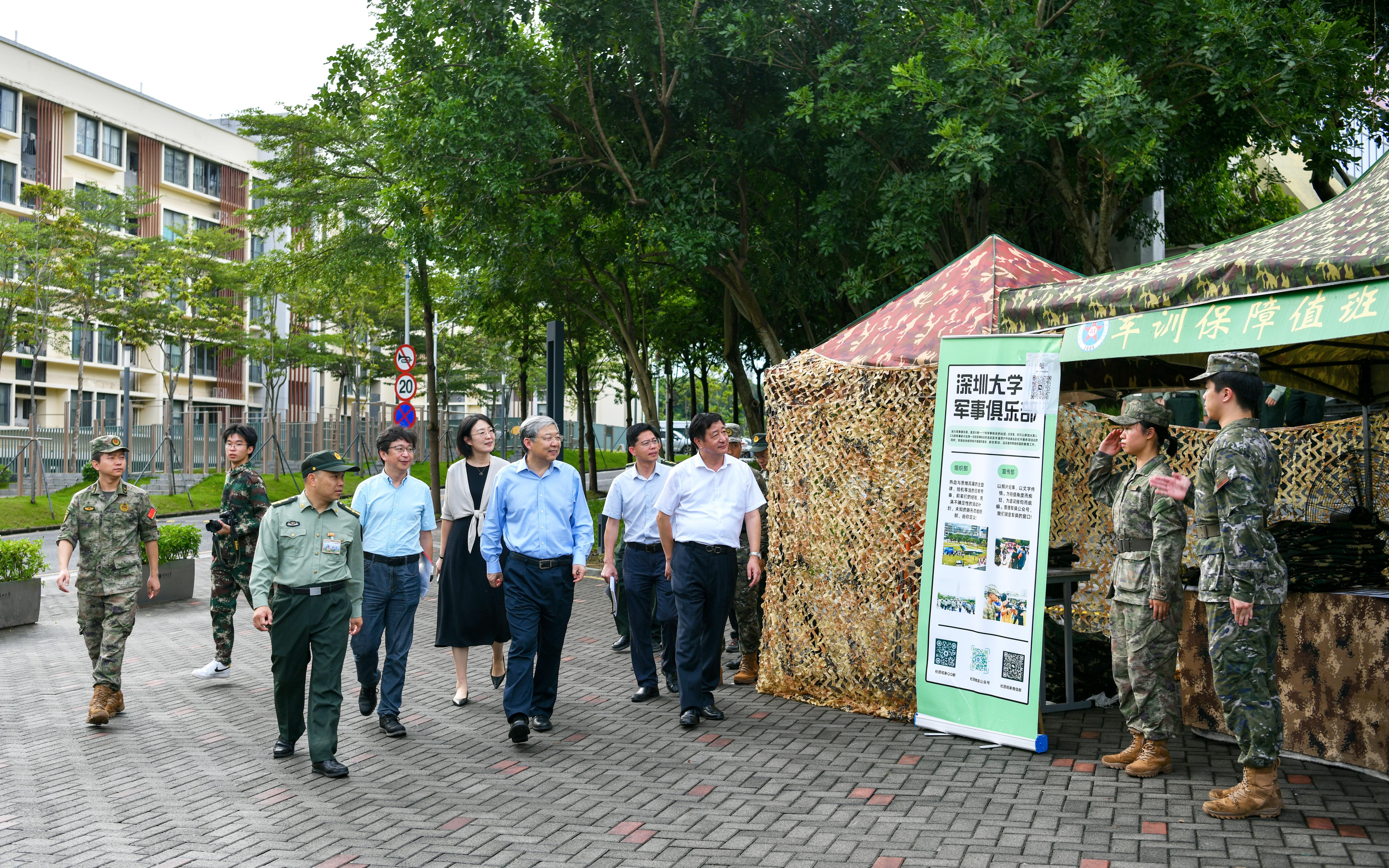 校领导还高度肯定了今年军训当中的创新亮点——由计算机与软件学院、信息中心和武装部携手研发推出的军训智慧管理系统。该系统通过深大版企业微信的军训相关应用,能实时掌握学生的各类军训状态数据,提高了武装部和军训团对军训各类事件的感知和处理能力,也便于指导员能节省出更多的时间下连队,去了解学生状态,做好思政教育工作,通过“军训信息化”和“军训智慧化”更好实现学校军训管理提质增效。
