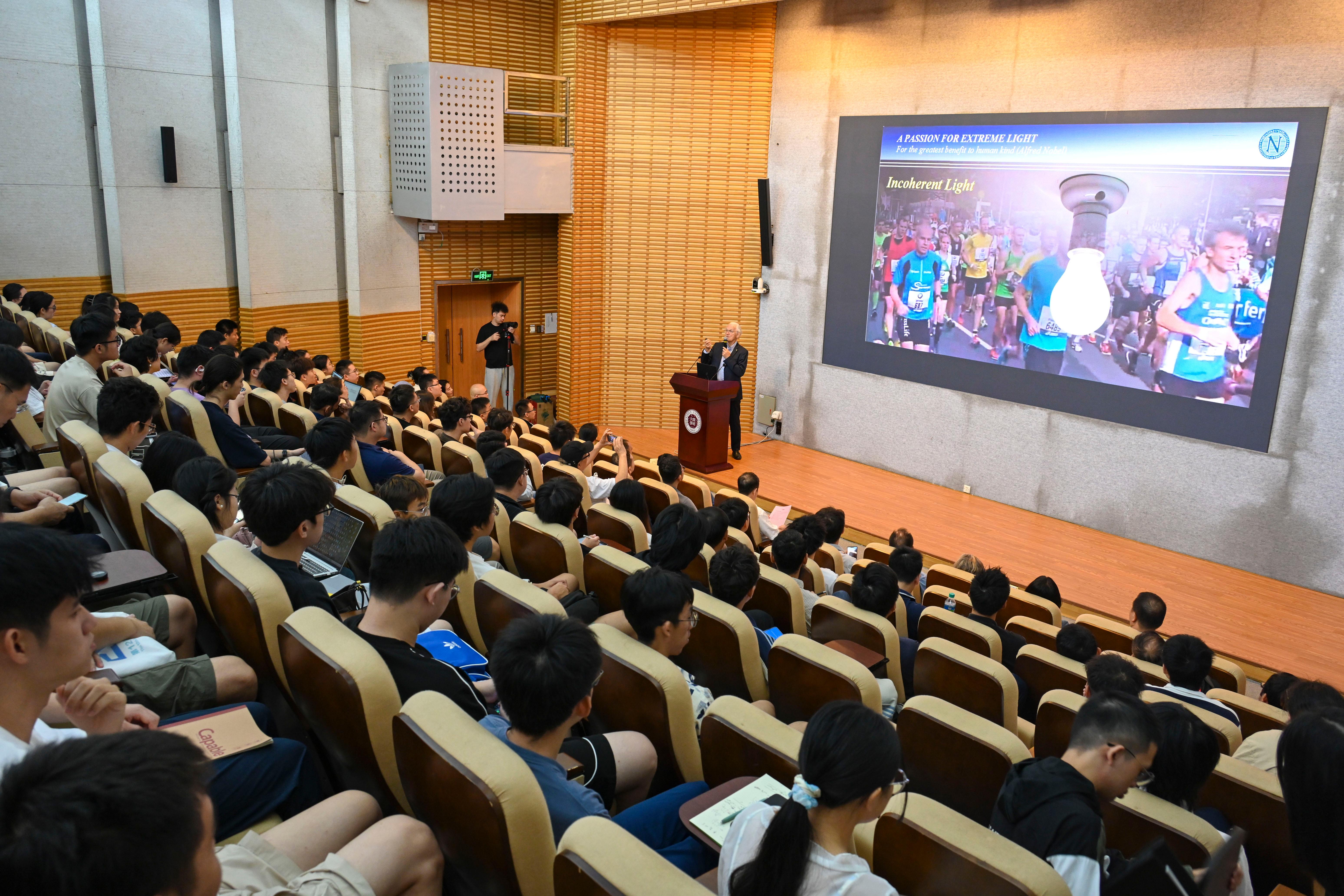 讲座上,穆鲁详细回顾了极端光学的发展历程,从1960年Theodore Maiman教授发明首台激光器开始,到现代超高强度激光的突破性进展,全面展示了这一领域的演变和其前沿应用。极端光学作为利用超短脉冲和超高强度激光研究极端物理条件下光学现象的前沿学科,已经取得了显著进展。