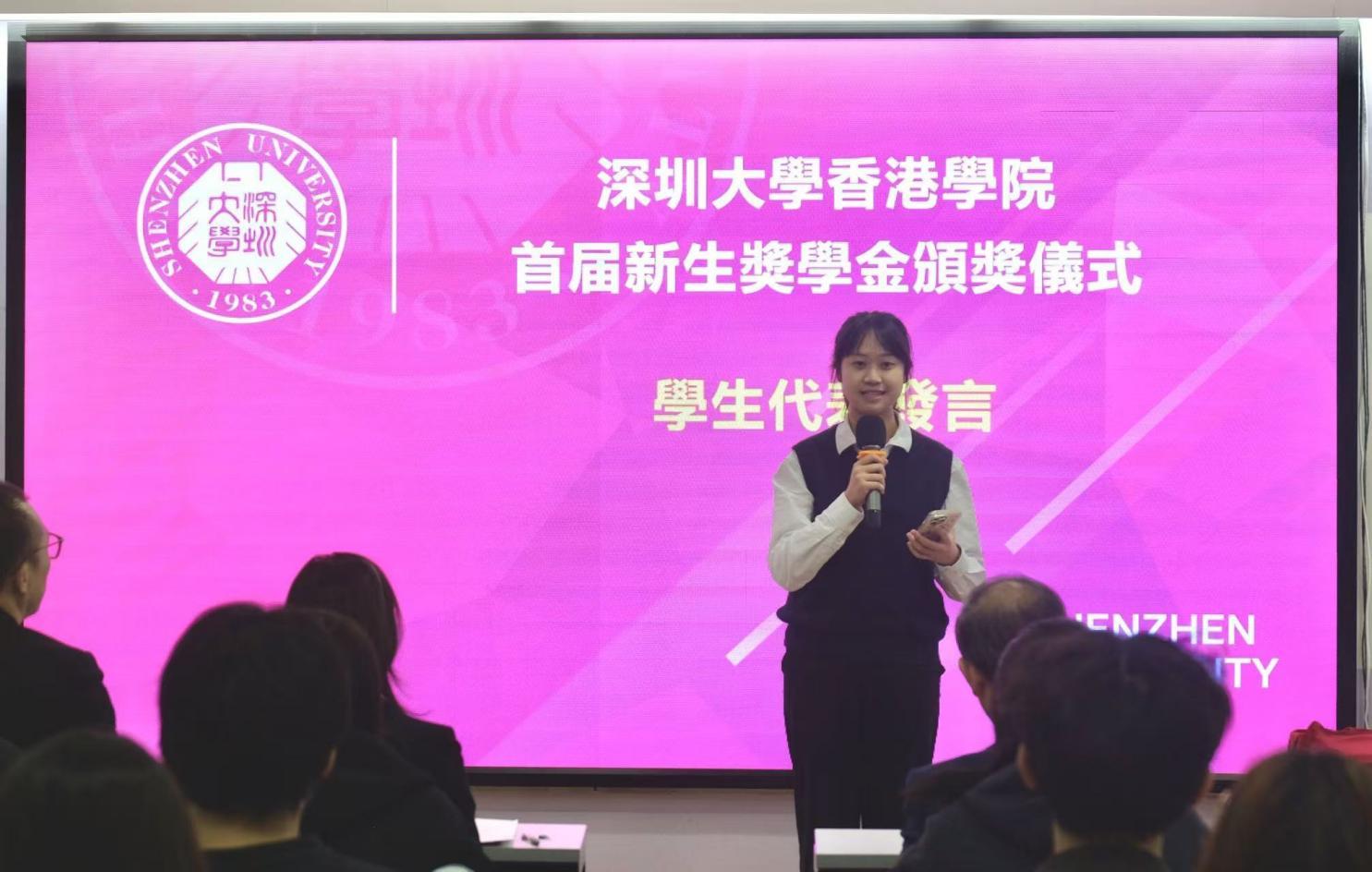 获得一等奖学金的林紫盈同学代表获奖学生发言。她表示,这份奖学金的荣誉承载着学校、学院和老师们的殷切期望与深情嘱托。她呼吁同学们携手并肩,在芒果体育香港学院这片充满希望的沃土上绽放青春的绚烂光彩,为璀璨的未来奋力拼搏。