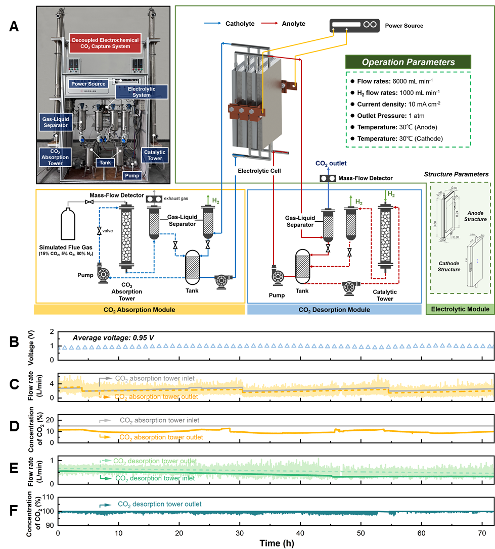 图3:CO2的电化学碳捕集原理样机与性能验证。A、原理样机与工艺流程;B、稳定性测试;C、吸收塔进出口流量;D、吸收塔进出口CO2浓度;E、解吸塔进出口流量;F、解吸塔出口CO2浓度。