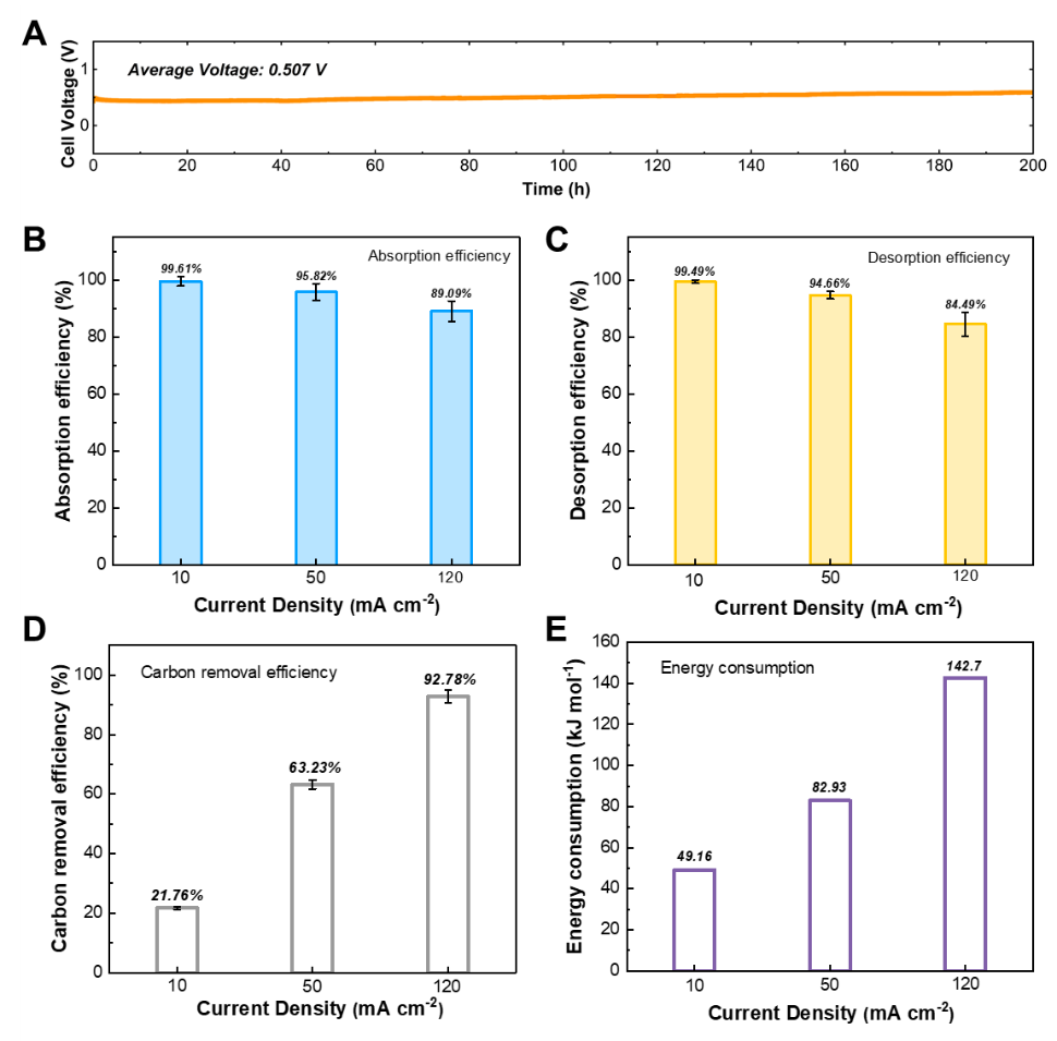 图2:氧化还原解耦的电化学碳捕集技术性能测试。A、200小时稳定性测试;B、不同电流密度下吸收效率;C、不同电流密度下解吸效率;D、不同电流密度下系统碳移除率;E、不同电流密度下系统捕集能耗。
