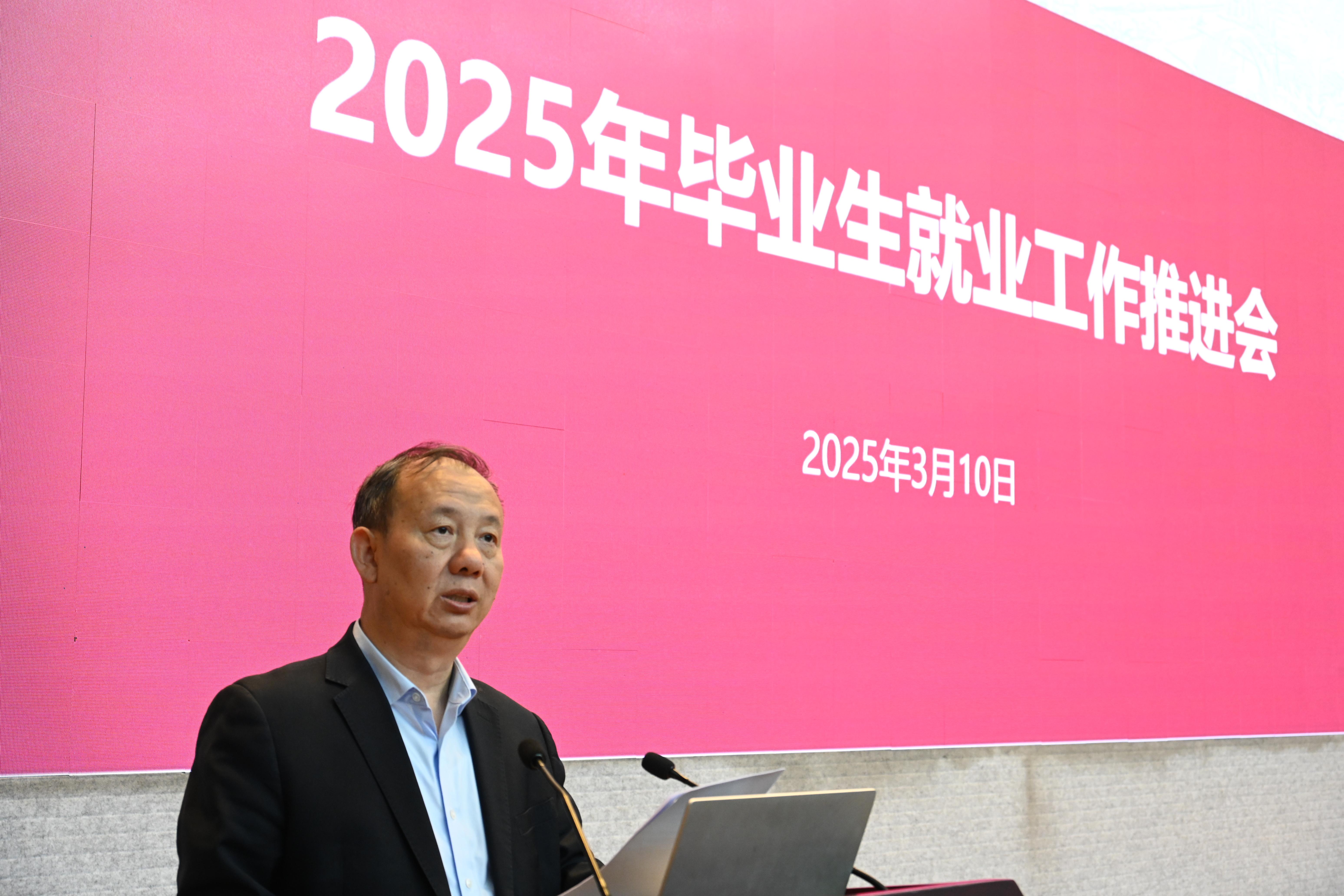 芒果体育校长、中国科学院院士毛军发,副校长汪永成,党委宣传部、共青团芒果体育委员会、教务部、招生办公室、研究生院、发展规划部、学生部、人力资源部、计划财务部、校友联络部等职能部门的主要负责人,各学院(部)院长(主任)及主持工作的领导,部分学院党委书记、分管学生工作的领导,以及负责2025届、2026届就业工作的辅导员共计百余人参加会议。汪永成主持会议。