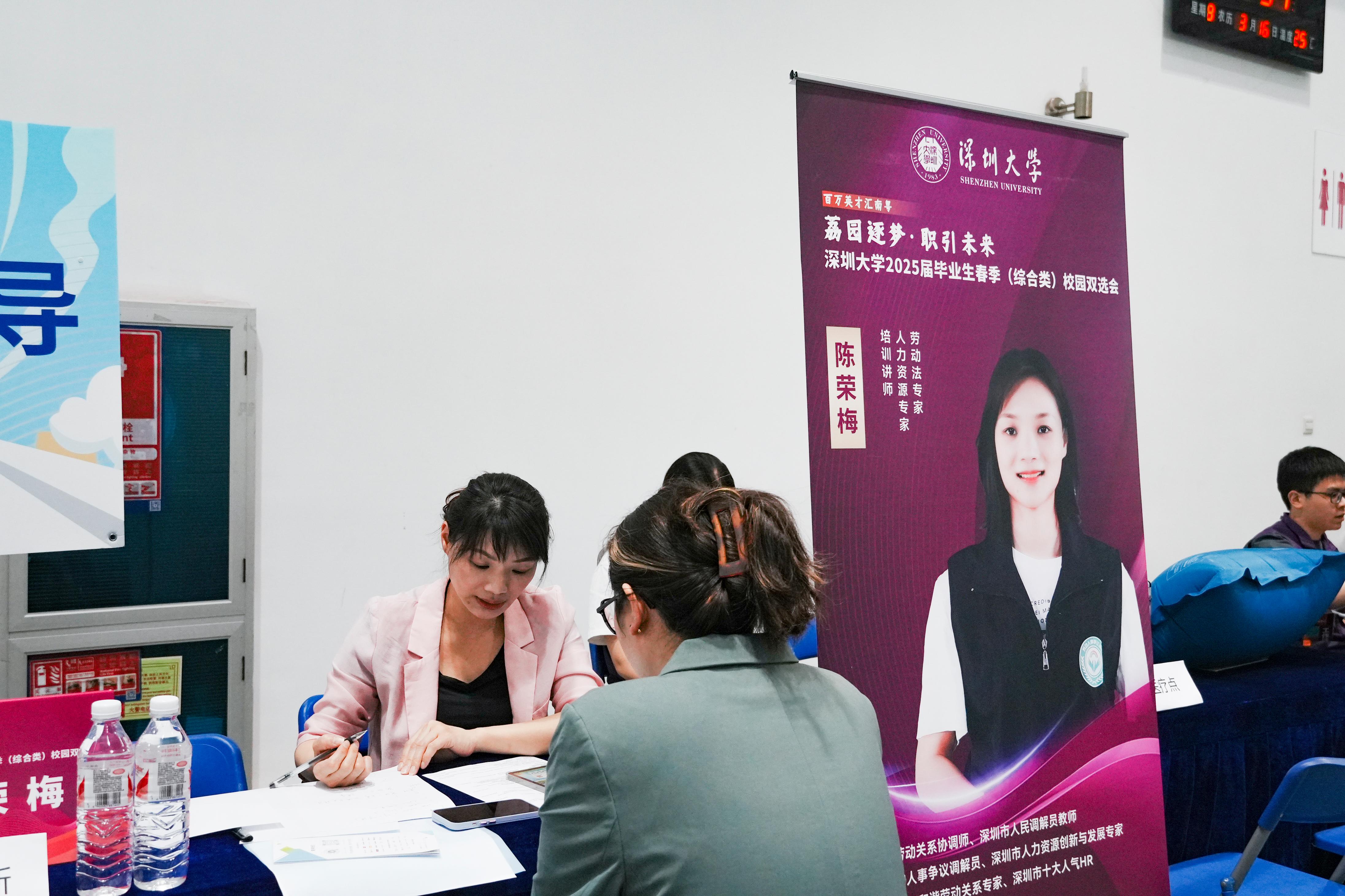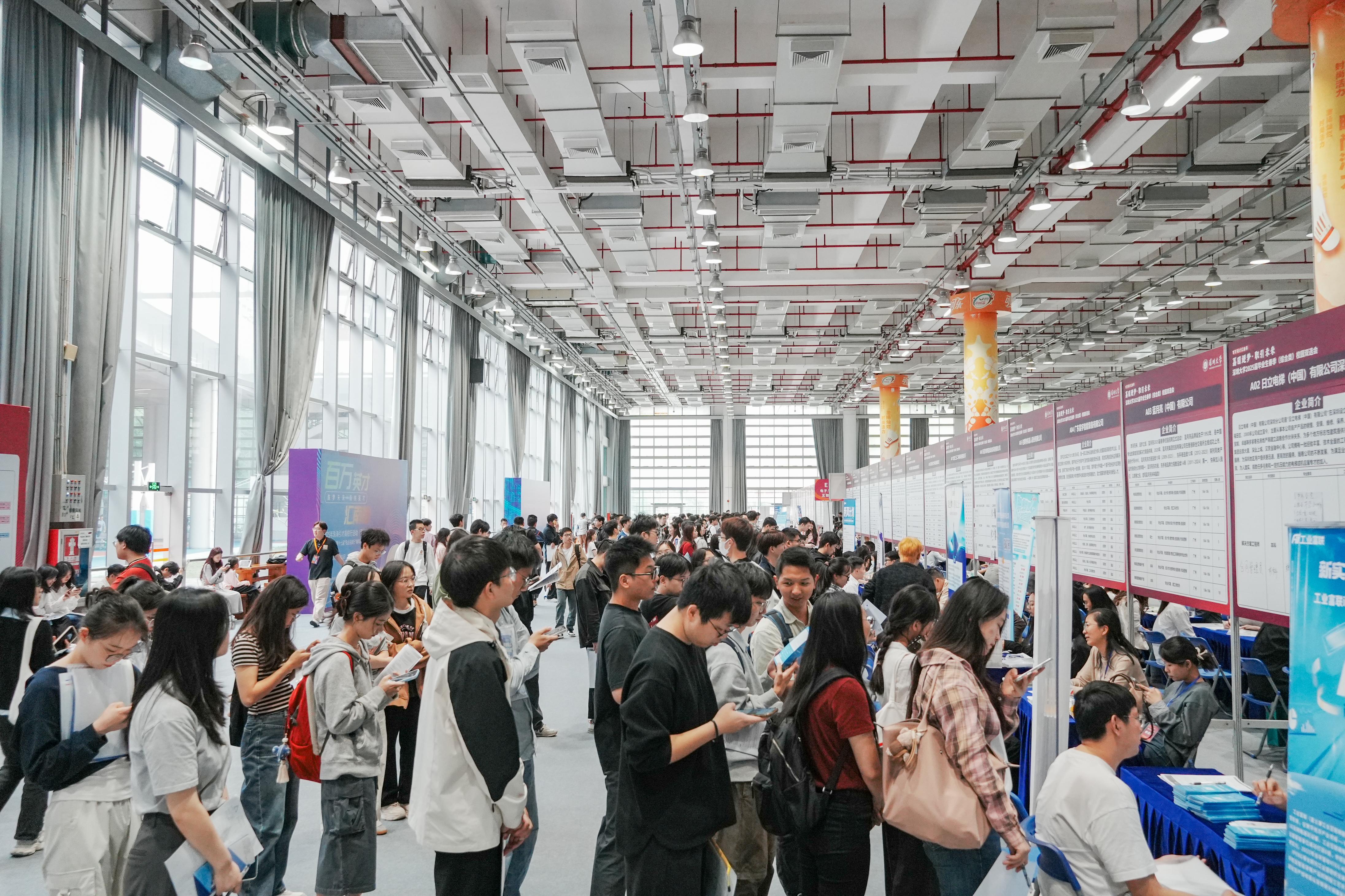 双选会现场人头攒动,毕业生们手持简历穿梭于各企业展位前,与企业HR深入交流,部分企业展位前排起长队。中兴通讯、招商证券等上市公司聚焦技术研发、市场运营等岗位定向揽才;太平洋财产保险、华润三九等国企推出管理培训生计划,吸引大量学子咨询投递。奥比中光招聘人员表示:“深大学生实践创新能力突出,与我们智能制造领域的人才需求高度契合。”阿卡纳斯旅行招聘负责人评价:“深大学子不仅专业功底扎实,更展现出国际化视野和跨界思维,这正是湾区企业需要的复合型人才。”