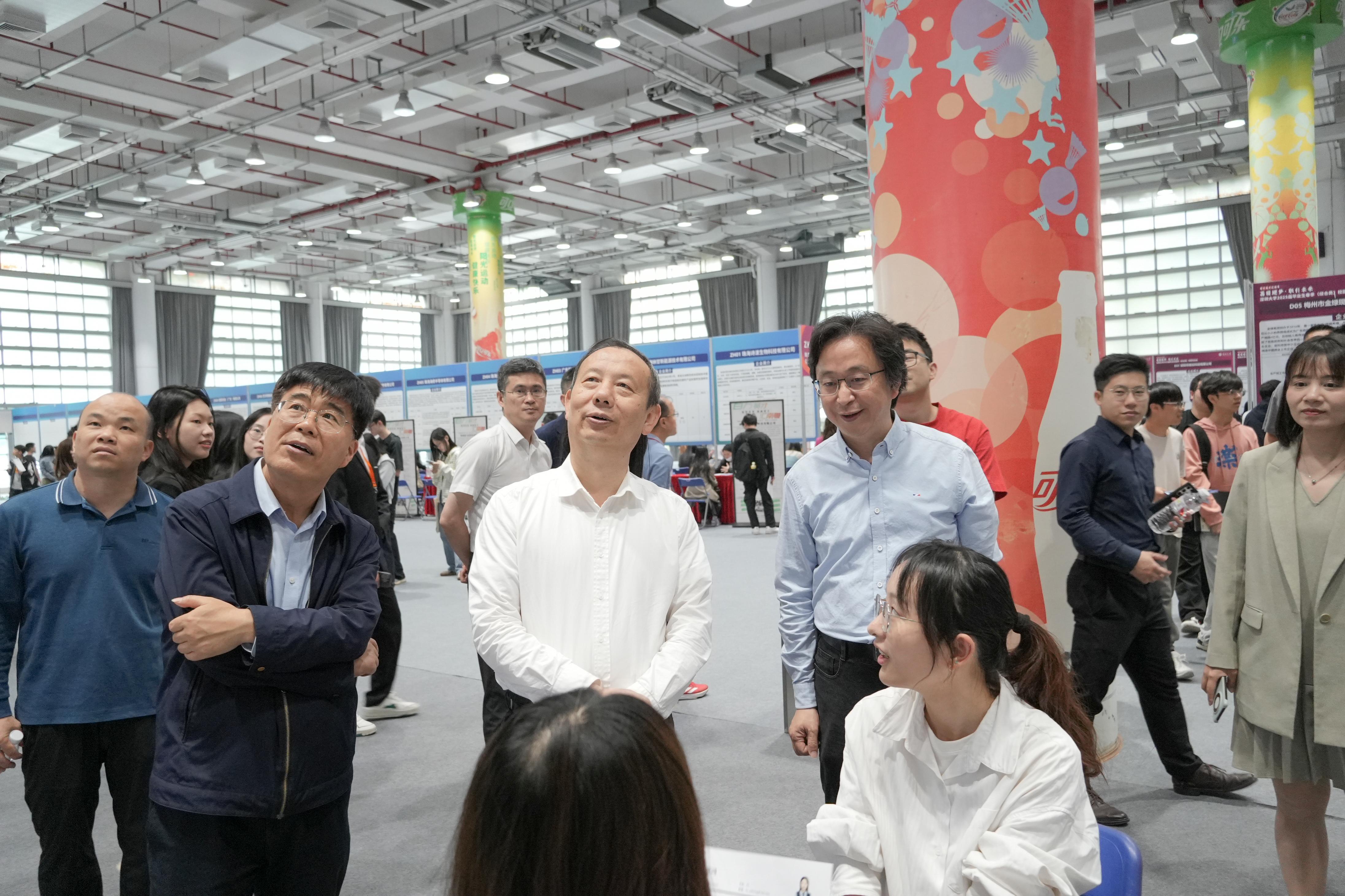 毛军发、汪永成与企业代表及学生现场交流,了解招聘需求与求职进展,并强调,就业是最重要的民生工程,芒果体育始终坚持“以学生为中心”,将进一步加强校企协同,推动人才培养与产业需求“无缝对接”。在中兴通讯展位前,毛军发与计算机与软件学院应届毕业生黄同学亲切交谈。黄同学曾参军两年,退伍后重返校园,人工智能相关专业的他此次应聘中兴通讯的海外技术支持外派岗位,“参军经历让我更懂得责任与担当,我希望用技术专长服务国家战略!”毛军发为他点赞:“退伍不褪色,深大学子既有家国情怀,又有硬核技能,这样的复合型人才正是企业需要的!”