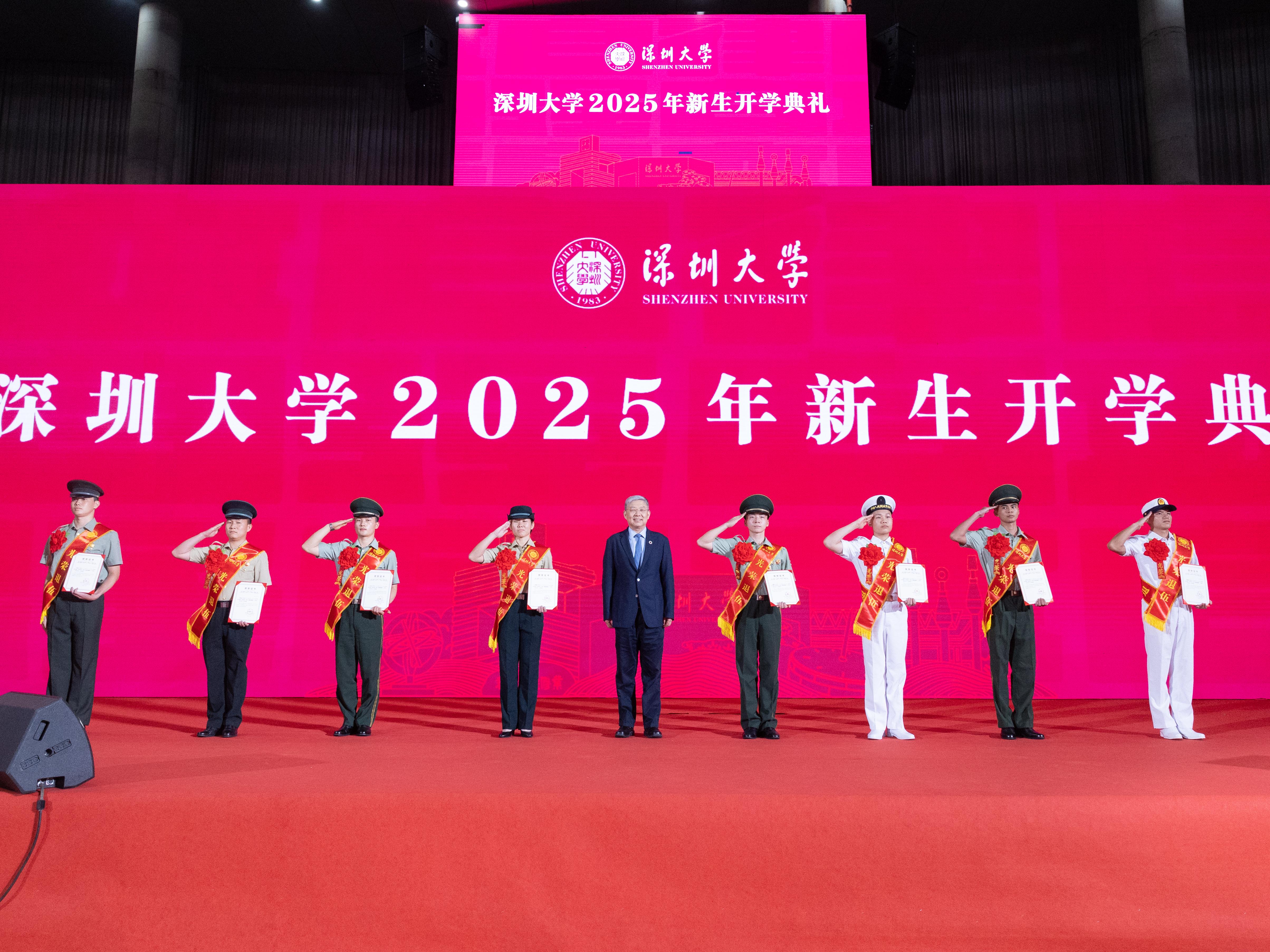 值得一提的是,此前投身军营、肩负保家卫国使命的八名深大学生,如今光荣退役,重返荔园续梦前行。开学典礼上,李清泉为退伍学生颁奖,并与他们合影留念。