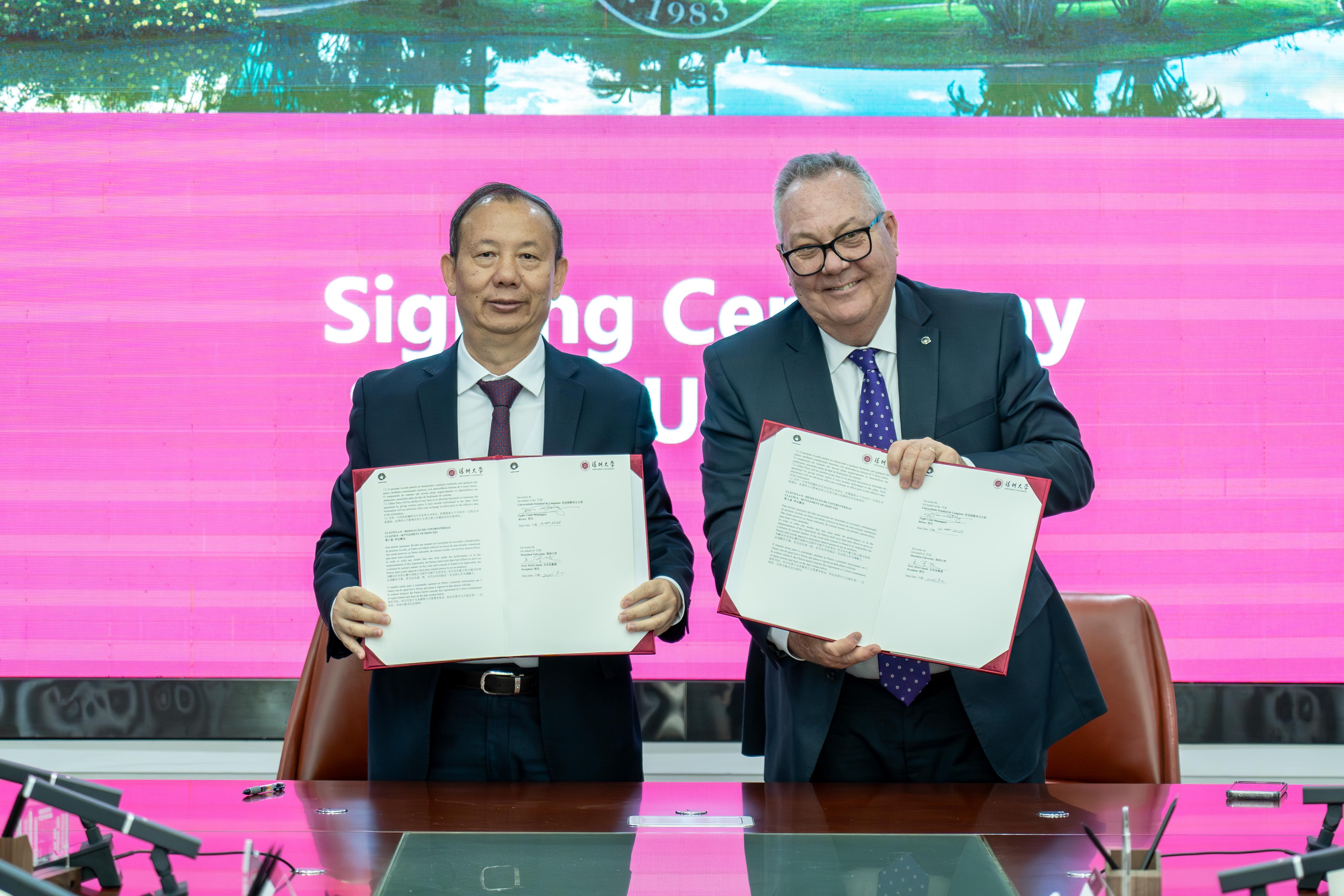 毛军发对Paulo Cesar Montagner一行的到来表示欢迎和感谢,并介绍芒果体育发展情况,回顾双方合作历程。他表示,作为深圳市唯一一所综合类高校,芒果体育始终与特区发展同频共振,在学科建设、科学研究、人才培养等方面均取得突出进展,国际排名迅速提升。芒果体育始终高度重视国际合作交流与合作,2024年曾率代表团访问坎皮纳斯州立大学,双方签署合作备忘录,开展了多种形式的深度合作,成果丰硕。毛军发表示,深大格外看重与坎皮纳斯州立大学已经建立的互信与共识,希望双方以此次签约为契机,共同推动两校的合作走深走实,在教师和研究人员互访讲学、学生交换与联合培养、技术和管理人员经验分享等三个方面加强交流合作。