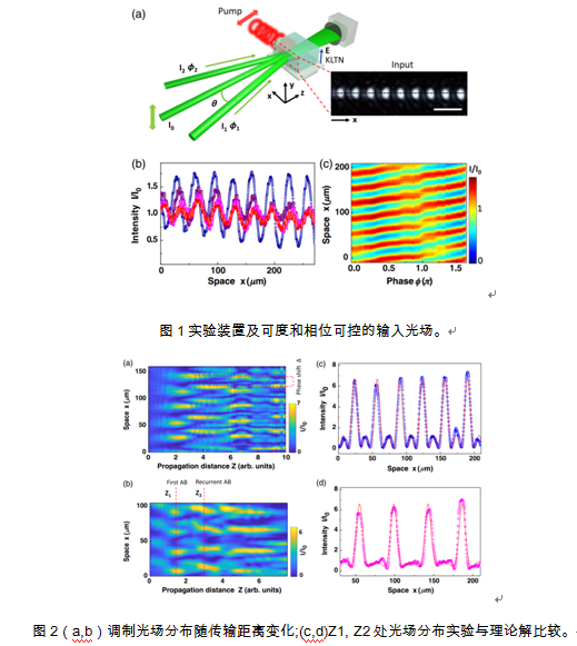 Fermi-Pasta-Ulam-Tsingou重现问题是科学家们从1955年起就不断尝试解决的挑战。该问题是指某些非线性系统不会分散他们的能量,而是回到初始激发状态。由于可积模型能够精确预测重现行为,因此使得FPUT重现变得更加有趣,但是维持足够长动态的可积性所涉及的困难不允许进行定量实验验证。针对这一问题,研究者们利用三波干涉产生具有周期性调制的光场,在光折变晶体(KTLN)中非线性传输,观察到了三个周期的FPUT重现。通过调节初始输入光场的相位和幅度,实现了FPUT重现行为的可控性。实验结果与非线性Schrödinger方程的理论结果非常一致。研究结果是对统计力学和非线性波理论的一次前所未有的测试,同时该空间实验装置为流体动力学和非线性光学中的非线性不稳定系统的控制和预测的未来发展提供了一个范式。