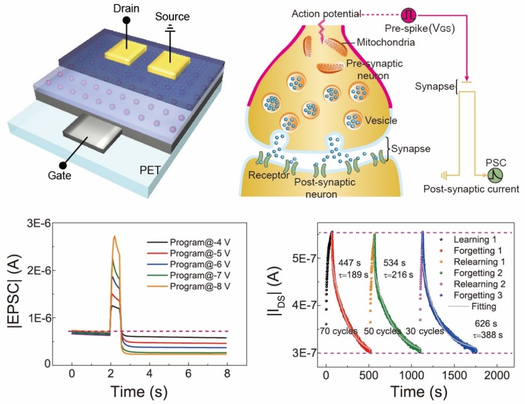 基于能驱动处理大量信息的高度连通性的生物神经形态系统,晶体管的人工突触有望克服神经形态计算的冯诺依曼瓶颈。在这项工作中,课题组首次使用C60 /PMMA杂化层验证了能够同时表现出信号传输和学习功能的人造有机柔性突触晶体管。通过简便的溶液工艺在PMMA中掺杂C60捕获位点以形成混合结构。柔性的突触晶体管具有2.95V的存储窗口,大于1000的开关比,编程/擦除耐受性周期超过500次。此外,本工作使用三端口晶体管模拟了多种生物突触功能,包括在不同脉冲持续时间,脉冲幅度和温度条件下的后突触电流,成对脉冲促进/抑制,沟道电导增强和抑制的连续调制,从短期可塑性到长期可塑性的转变以及重复性的学习与遗忘过程。具有低操作电压和可控电荷捕获极性的C60突触晶体管的实现是使用有机电子器件进行未来神经形态计算的重要一步。