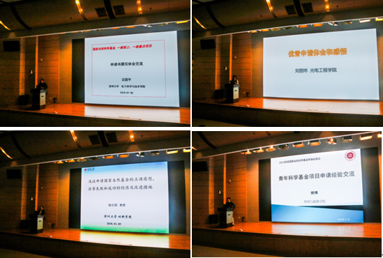 在本次动员大会中,四位经验丰富的老师受邀为现场申报人员分享了历年来项目申请的成功经验。其中,电子科学与技术学院汪国平院长重点介绍国家自然科学基金申请书撰写体会;光电工程学院刘丽炜老师重点介绍优秀青年科学基金项目申报体会和感悟;材料学院陈仕国老师重点介绍申请国家自然基金面上项目的感想,分享失败和成功的经历及改进措施;物理与能源学院樊博老师则重点介绍青年科学基金项目申报经验。四位老师的分享交流为现场申报人员带来许多优质的可供借鉴的成功经验,这也为提升本年度我校教师及科研人员基金申报工作质量提供了优良条件。